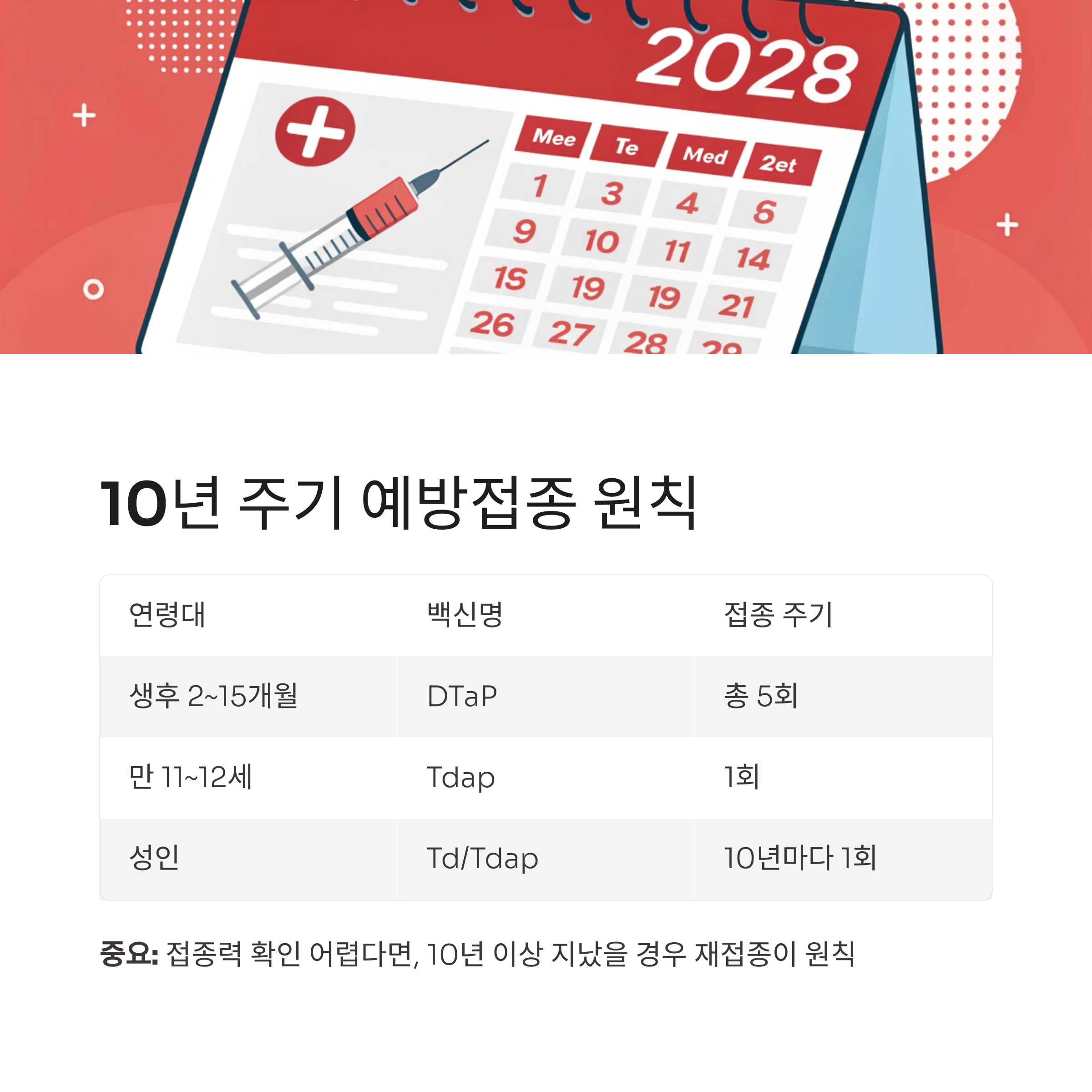 기본 접종이 완료되었다 하더라도 **10년마다 1회 추가접종(부스터샷)**이 필요합니다.