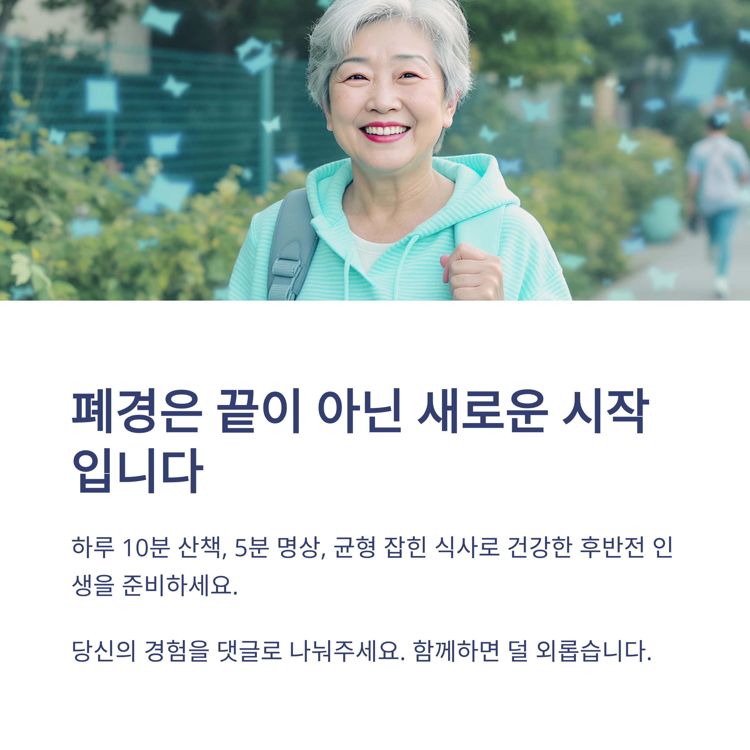 폐경 전후 증상은 때로 혼란스럽고 당황스러울 수 있지만, 그 변화를 이해하고 준비한다면 충분히 지혜롭게 지나갈 수 있습니다. 생리 주기 변화, 안면홍조, 수면장애, 감정기복, 골밀도 감소, 피부와 모발 변화, 질건조증 등은 모두 폐경 전후에 흔히 나타나는 증상입니다. 중요한 것은 이 모든 변화를 '내 이야기로 받아들이고, 스스로를 돌보는 출발점'으로 삼는 것입니다. 하루 10분의 산책, 5분의 명상, 균형 잡힌 식사, 규칙적인 수분 섭취—이 작은 실천들이 모이면 몸과 마음에 큰 힘이 됩니다. 폐경은 끝이 아니라 새로운 시작입니다. 두렵기보다는 나 자신을 존중하고, 슬기롭게 대처하며, 스스로의 삶에 더 집중하는 시간으로 만들어보세요. 여러분의 건강하고 밝은 후반전 인생을 응원합니다.