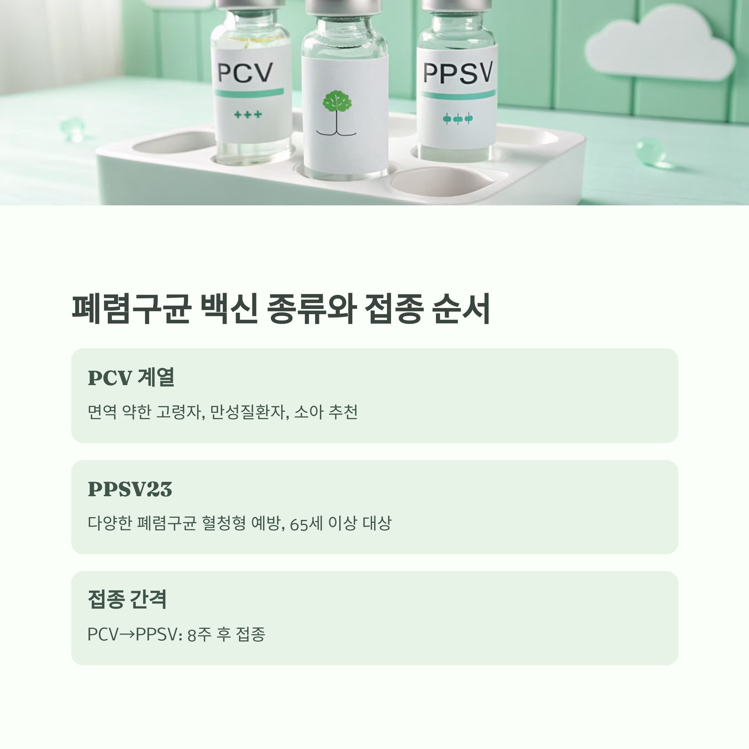 - PCV13 또는 PCV15, PCV20: 면역이 약한 고령자, 만성질환자, 소아에게 추천