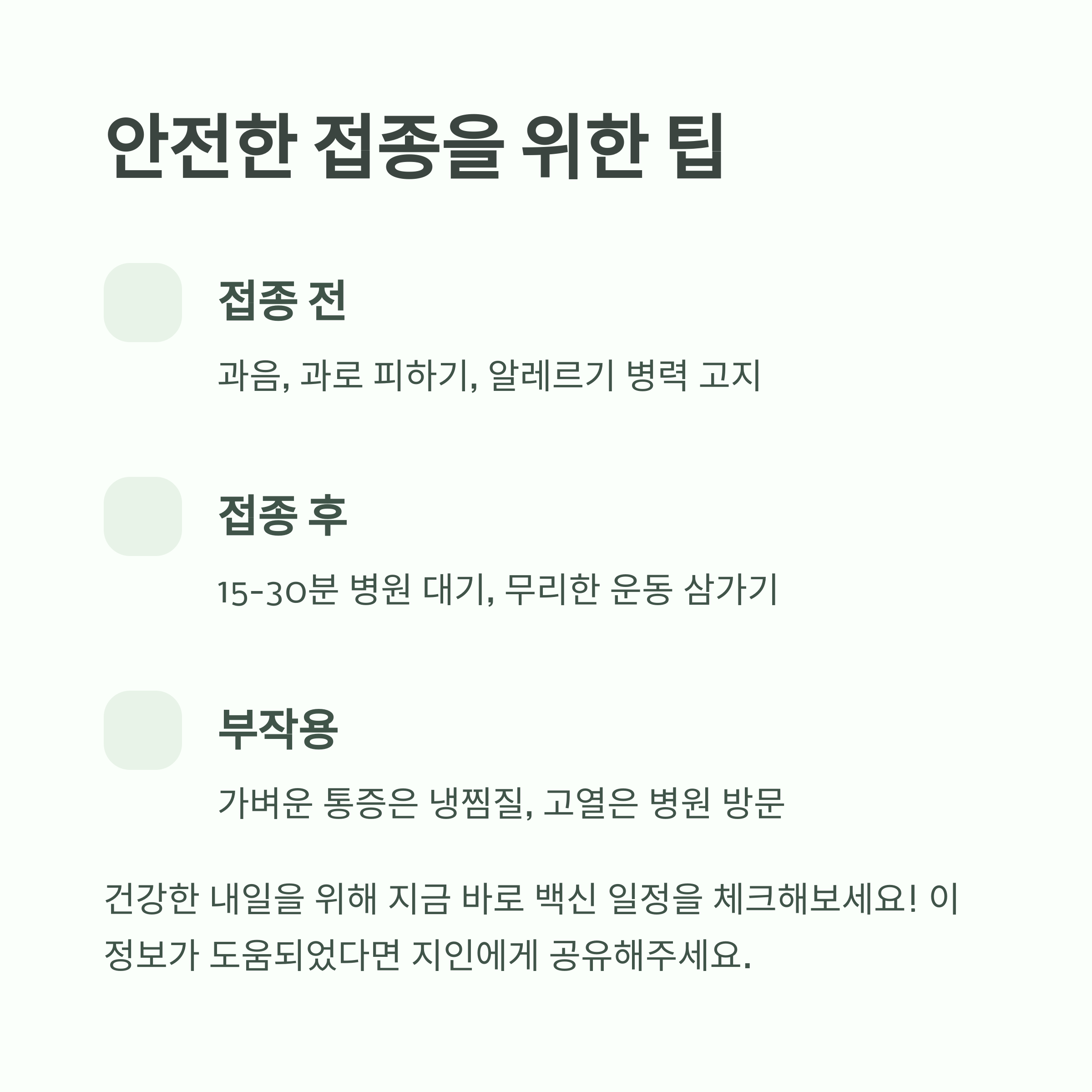 폐렴구균 예방접종을 보다 안전하게 진행하기 위해서는 사전 준비와 이후 관리가 중요합니다. 다음 팁들을 기억해 두면 도움이 됩니다.