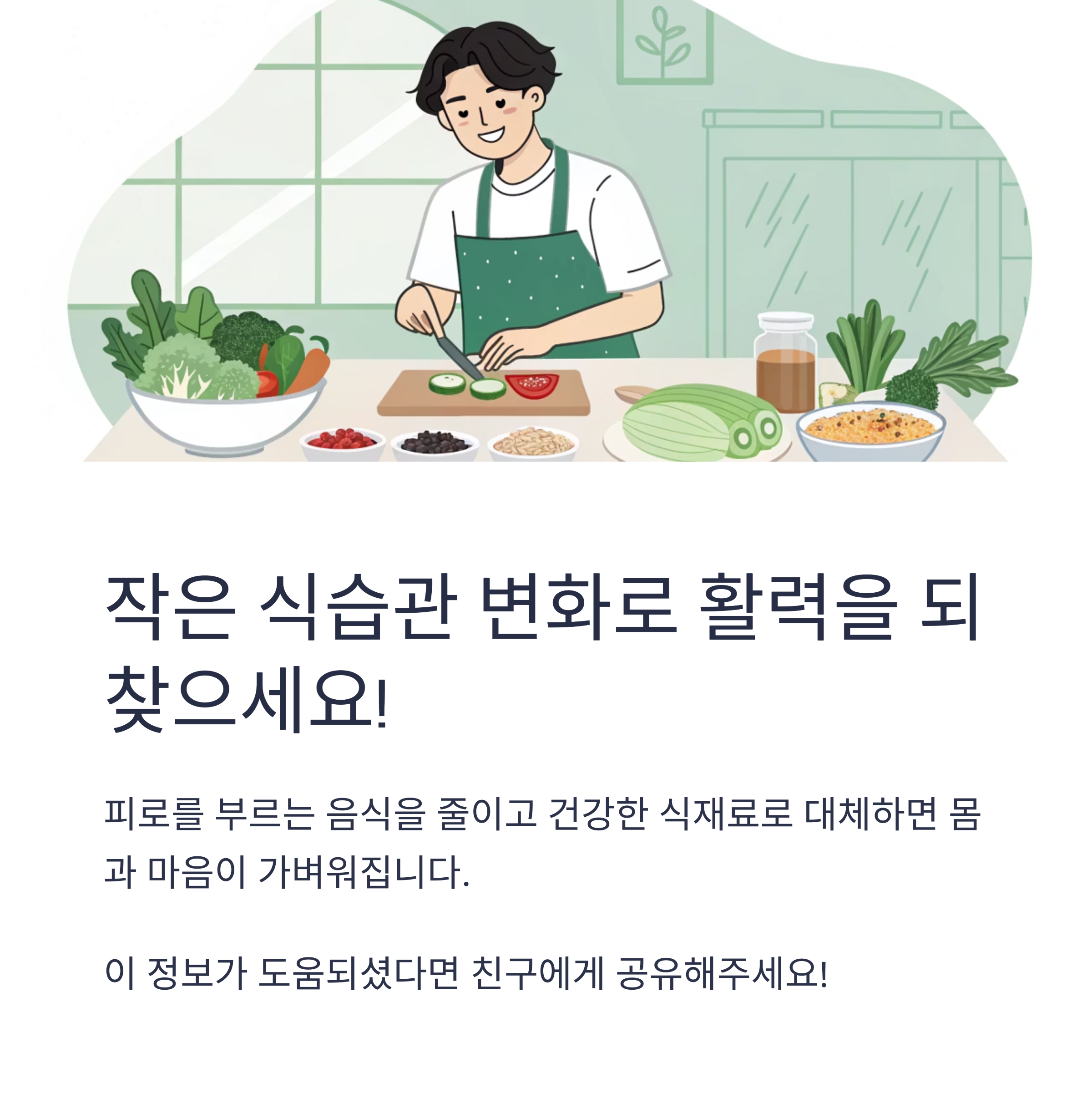 하루 종일 피곤하다는 느낌, 사실은 우리의 입속으로 들어가는 음식이 원인일 수 있다는 사실, 이제는 알고 계시죠? 피로를 부르는 음식을 하나씩 줄이고, 에너지를 주는 건강한 식재료로 대체해 보세요. 큰 변화가 아니어도 작은 실천이 쌓이면 몸도 마음도 훨씬 가벼워질 거예요. 오늘 소개한 음식들을 기억하고, 여러분의 식탁을 조금 더 활기차게 바꿔보시길 응원합니다!