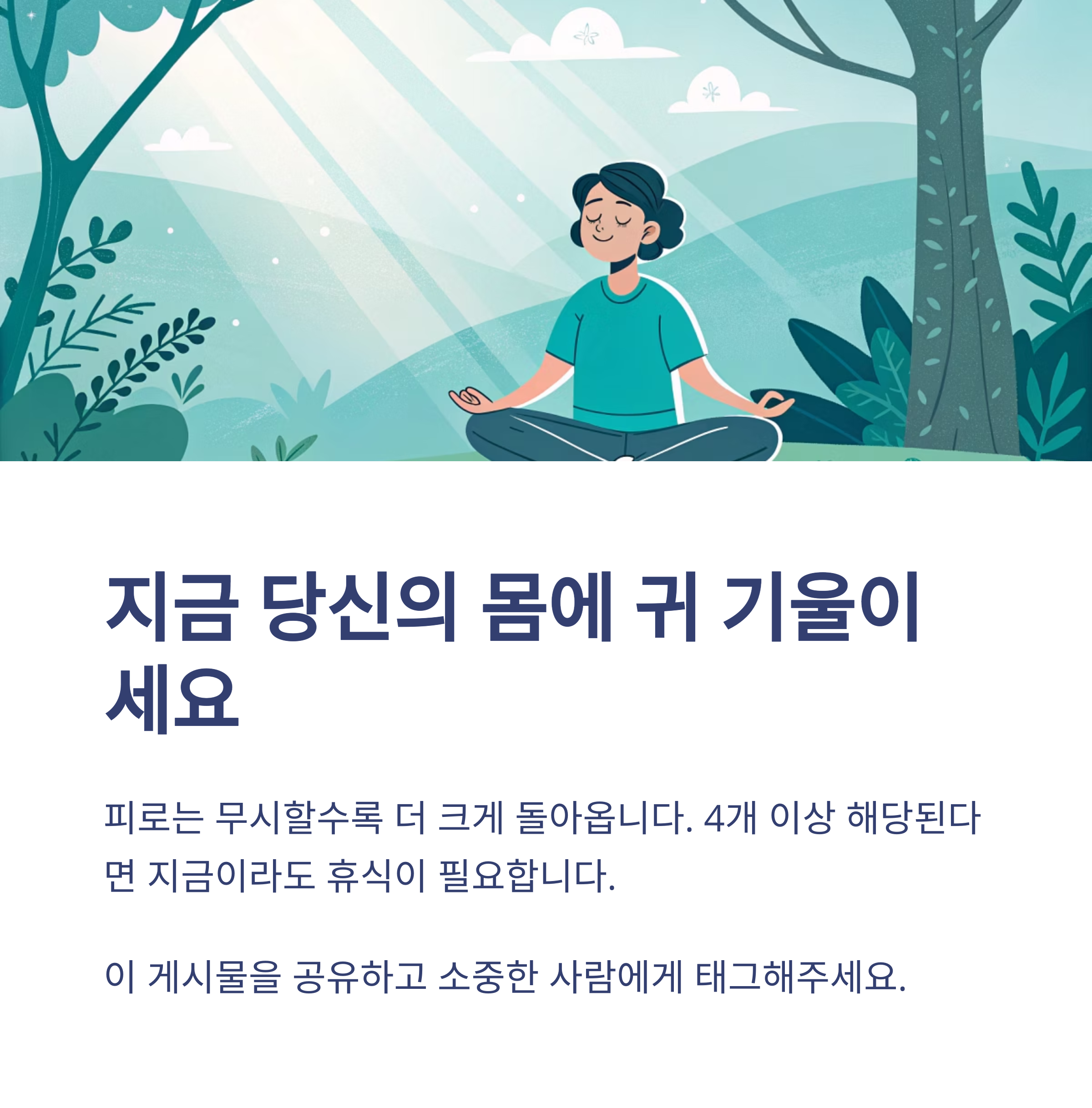 내가 지금 피로 누적 상태인지 간단히 체크해 보세요. 아래 항목 중 4개 이상 해당된다면, 지금이라도 휴식이 꼭 필요하다는 신호입니다.
