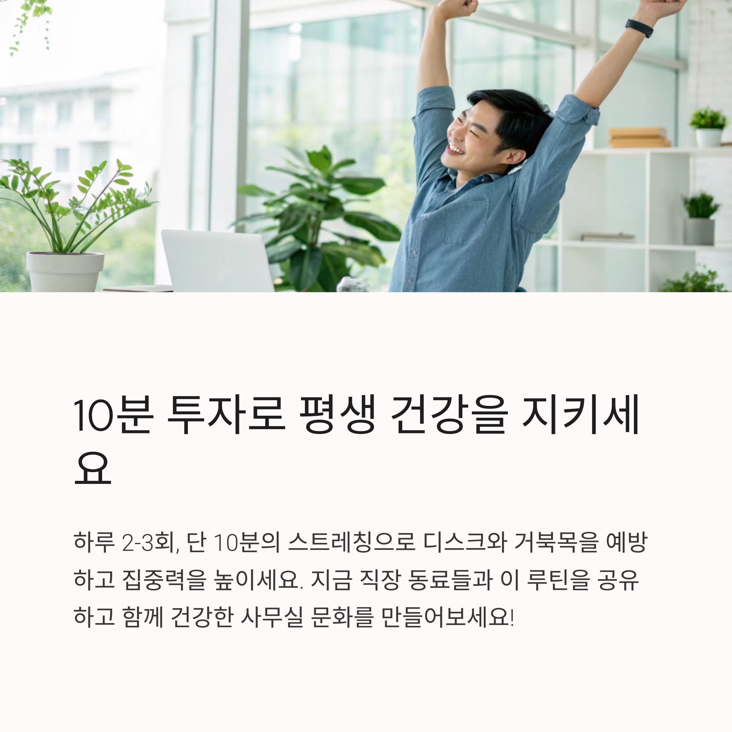 몸을 위한 투자, 반드시 거창할 필요는 없습니다. 의자에 앉아서 단 10분, 그것도 하루에 2~3번만 실천해도 우리 몸은 반응을 보여줍니다. 중요한 건 ‘지금’ 시작하는 것이죠. 지금 이 글을 읽고 계신 여러분도, 딱 10분만 투자해 보세요. 의외로 몸은 금방 달라진답니다. 실천하시고 느낀 변화가 있다면 댓글로 함께 나눠주세요. 😊