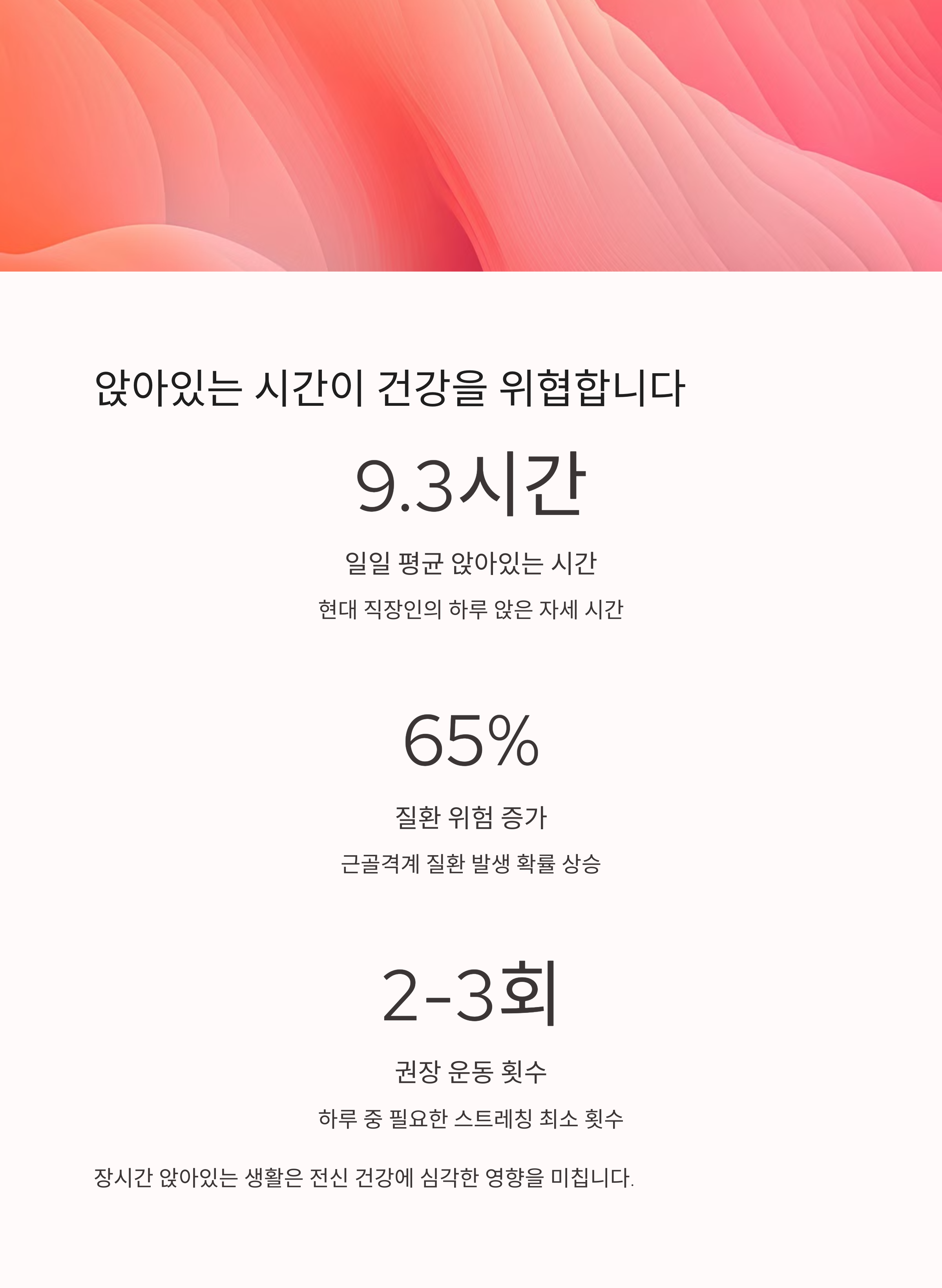 | 사무직 직장인 | 목-어깨-척추 스트레칭 중심 / 매 2시간마다 5분 간격 |
