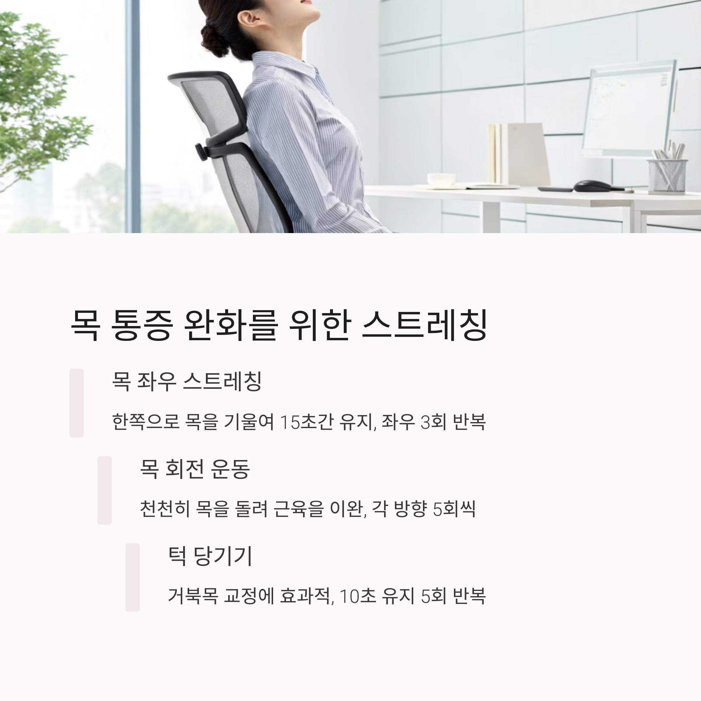 | 0~2분 | 목 좌우 회전 & 승모근 이완 | 경추 압박 완화, 집중력 회복 |