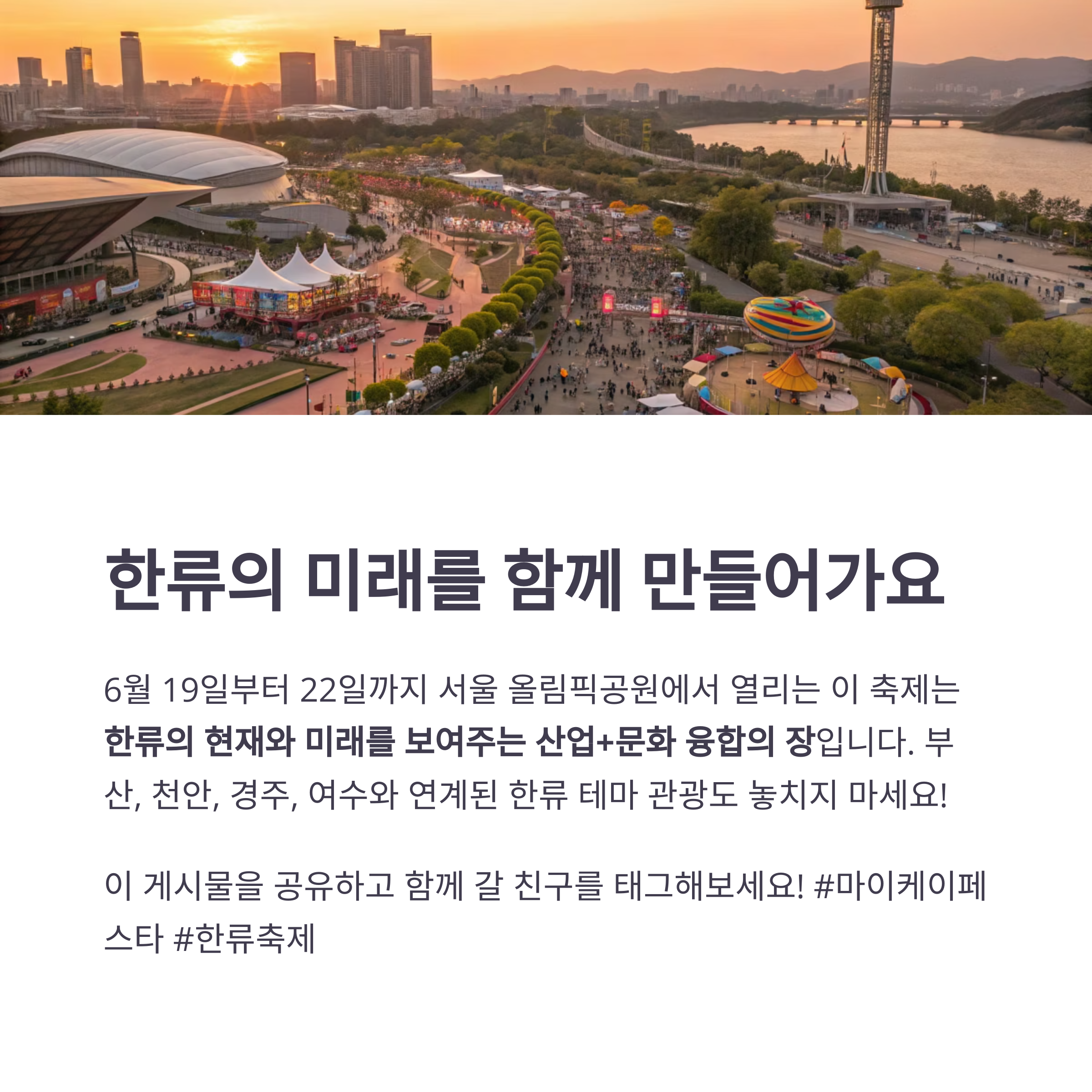 ‘2025 마이케이 페스타’는 단순한 이벤트가 아니라, 한류의 현재와 미래를 보여주는 산업+문화 융합의 장입니다. 세계적인 팬덤을 이끌고 있는 K-콘텐츠가 실제로 어떻게 사람을 모으고, 산업으로 확장되고, 국경을 넘나드는지 직접 눈으로 확인할 수 있는 기회입니다.