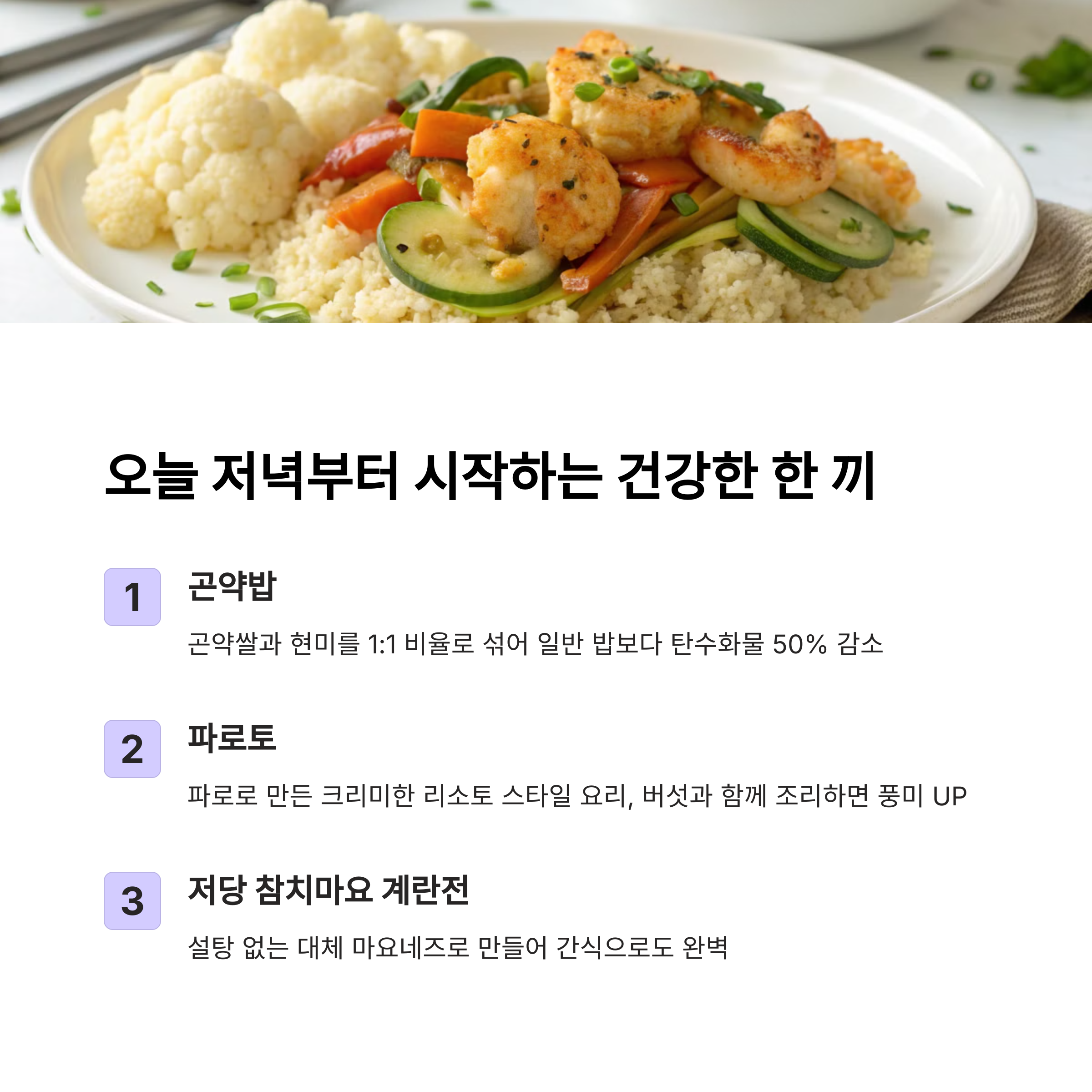 오늘 소개해드린 저당 레시피들은 그러한 기준에 맞춰 맛과 영양, 간편함을 모두 고려하여 구성한 메뉴들입니다.
