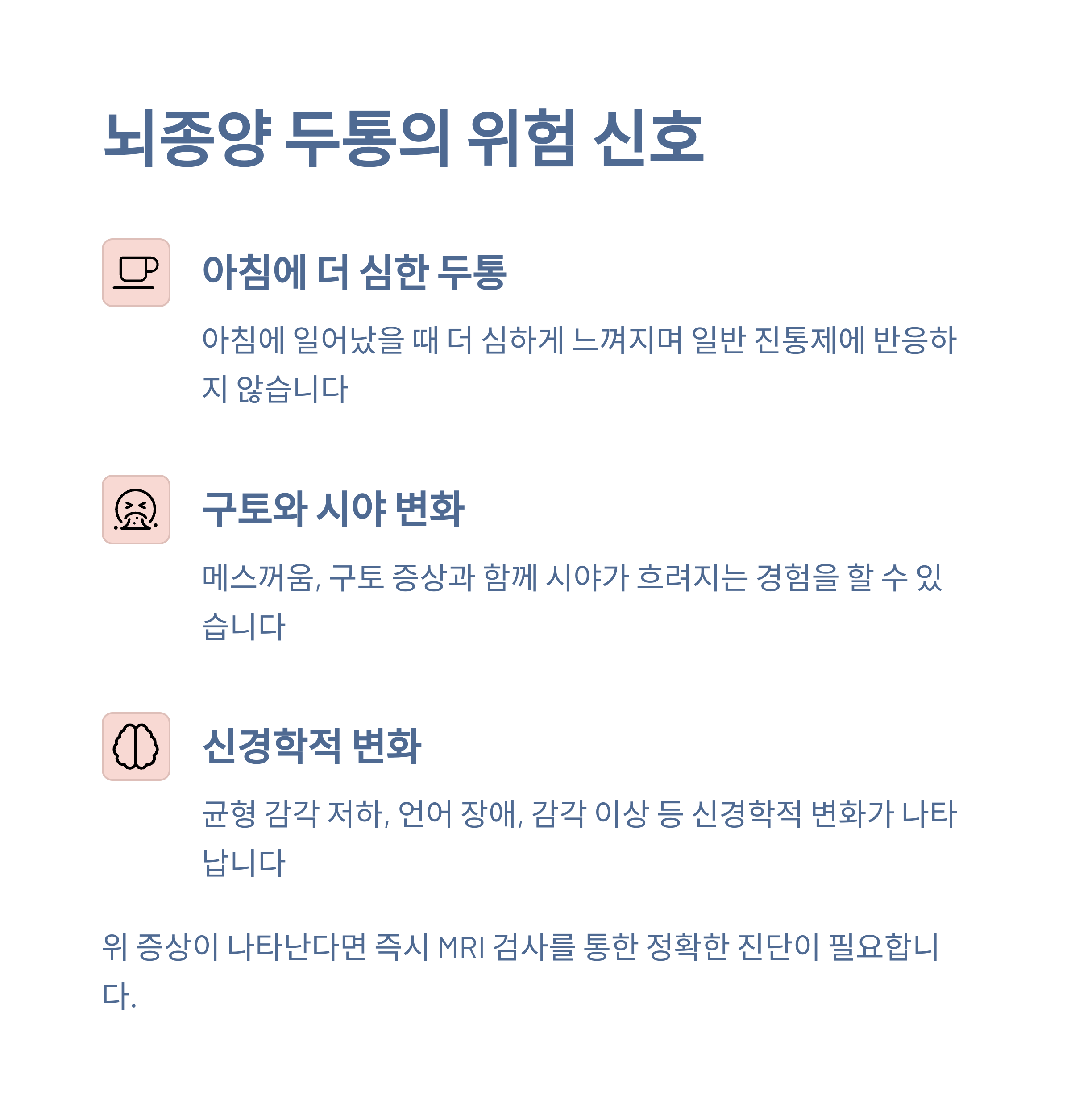 일반적인 두통과 다르게, 뇌종양이 원인인 경우 특정한 경고 신호들이 나타날 수 있어요. 특히 다음과 같은 증상이 나타난다면 절대로 무시해서는 안 됩니다.