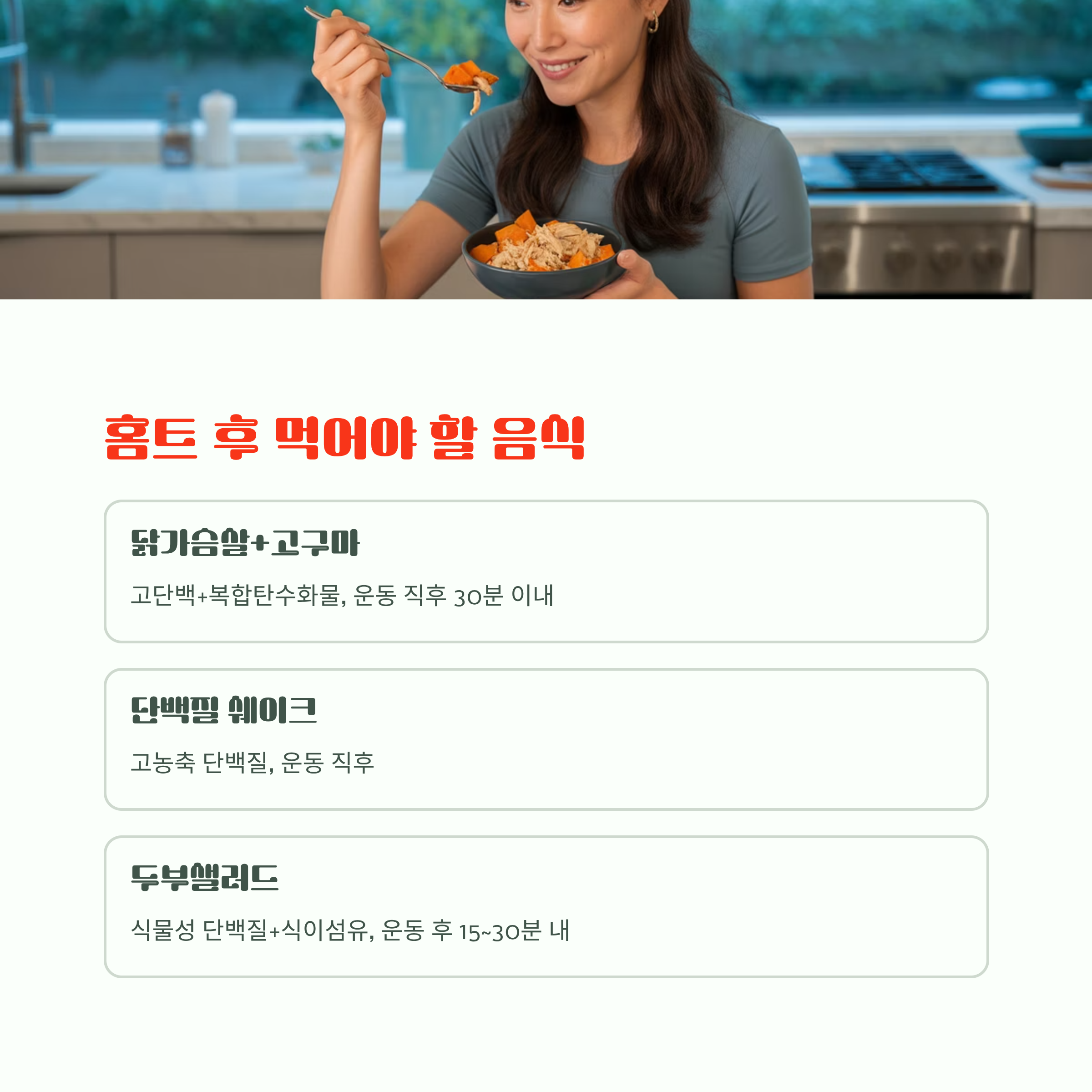| 두부샐러드 | 식물성 단백질 + 식이섬유 | 운동 후 15~30분 내 |