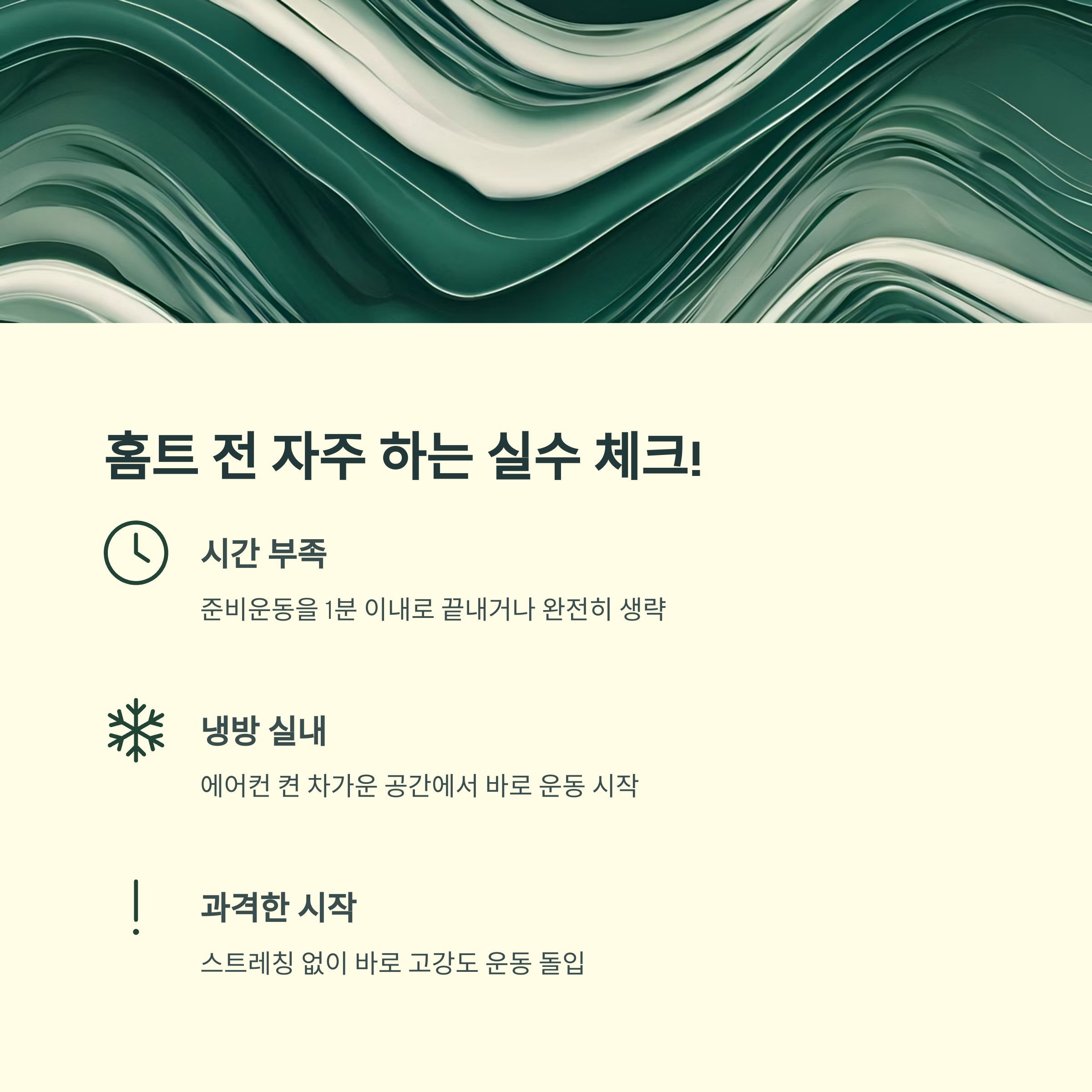 안녕하세요! 요즘 집에서 홈트레이닝 많이들 하시죠? 저도 헬스장 대신 거실에서 매트 하나 깔고 운동하는 게 일상이 되었는데요, 처음엔 매번 근육통에 시달리고, 심지어 가벼운 통증이 생기기도 했어요. "내 자세가 잘못된 걸까?" 싶었는데 알고 보니 가장 중요한 걸 빼먹고 있었더라고요. 바로 '준비운동'이에요. 오늘은 홈트 전 필수로 해야 할 준비운동에 대해 아주 쉽고 구체적으로 알려드릴게요. 이걸 알고 나면 운동 효과는 물론, 부상 위험까지 줄일 수 있어요. 함께 꿀팁 알아봐요!