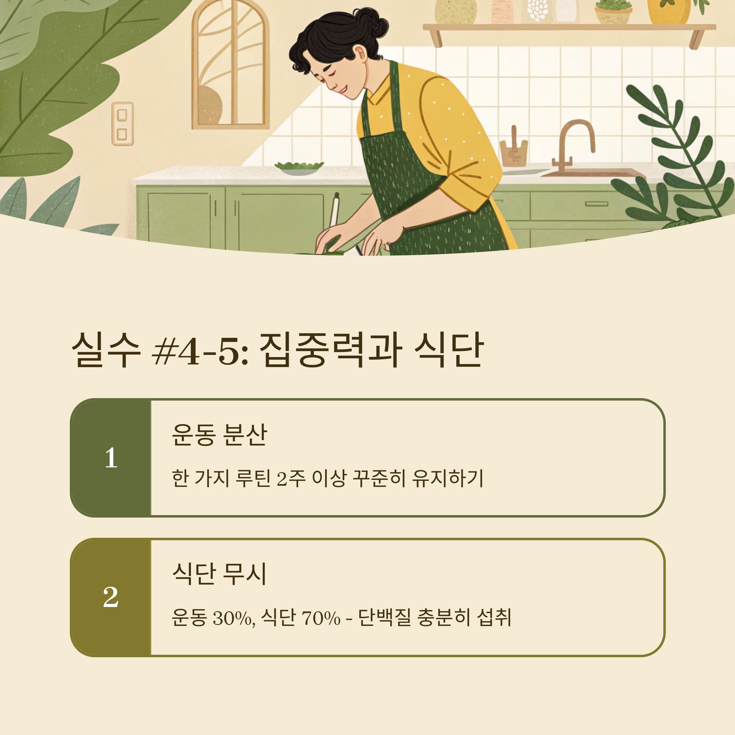 “3일 하고 포기했다”는 말을 많이 들어보셨죠? 그 이유 중 하나는 운동 강도를 처음부터 너무 높게 잡는 실수 때문이에요. 예를 들어 하루 1시간 이상 고강도 루틴을 따라하다 보면 몸이 버티지 못해요. 운동은 ‘꾸준히’가 핵심인데, 처음부터 과도한 계획은 오히려 동기부여를 꺾고 몸에 부담만 줍니다.