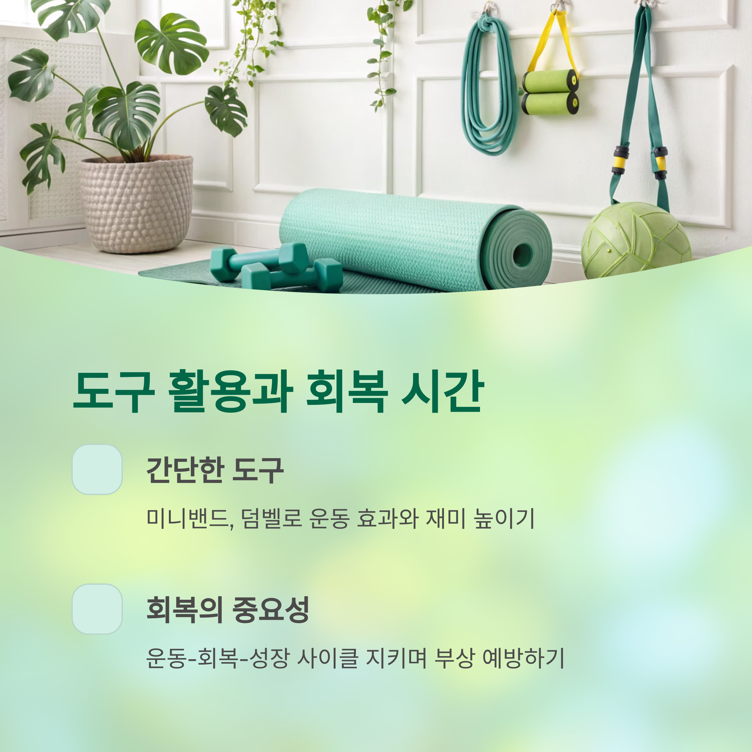 홈트는 집에서 할 수 있는 장점이 있지만, 맨몸 운동만으로는 금방 지루해질 수 있습니다. 이럴 때 간단한 운동 도구 몇 가지만 있어도 운동의 다양성과 재미가 확 올라가요. 대표적인 홈트용 도구로는 요가 매트, 미니 밴드, 덤벨, 폼롤러 등이 있습니다. 각각의 도구는 운동 효과를 높여주고, 근육 자극을 다양하게 할 수 있게 도와줍니다.