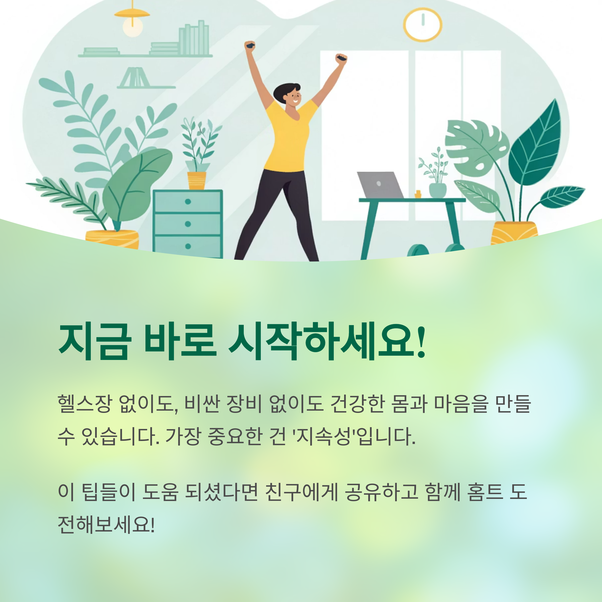 홈트는 단순한 유행이 아닌, 꾸준한 자기 관리의 방식이 될 수 있습니다. 헬스장 가지 않고도, 비싼 장비 없이도, 충분히 건강한 몸과 긍정적인 마인드를 만들 수 있어요. 무엇보다 중요한 건 ‘지속성’이고, 그 지속성을 위해 오늘 소개한 7가지 팁이 큰 도움이 되길 바랍니다. 나만의 공간에서, 나만의 속도로 건강을 쌓아가는 홈트, 지금 이 순간부터 시작해 보세요!