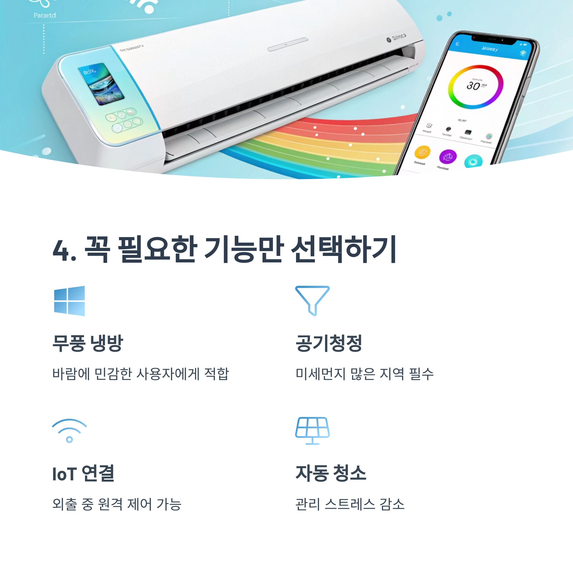 에어컨에는 다양한 기능이 있지만, 모두가 필요하지는 않습니다. 실속형으로 구매하고 싶다면 ‘내가 자주 쓸 기능’을 중심으로 골라야 합니다. 특히 고가 제품일수록 기능이 많지만, 실제 사용하는 건 몇 가지뿐인 경우가 많아요.