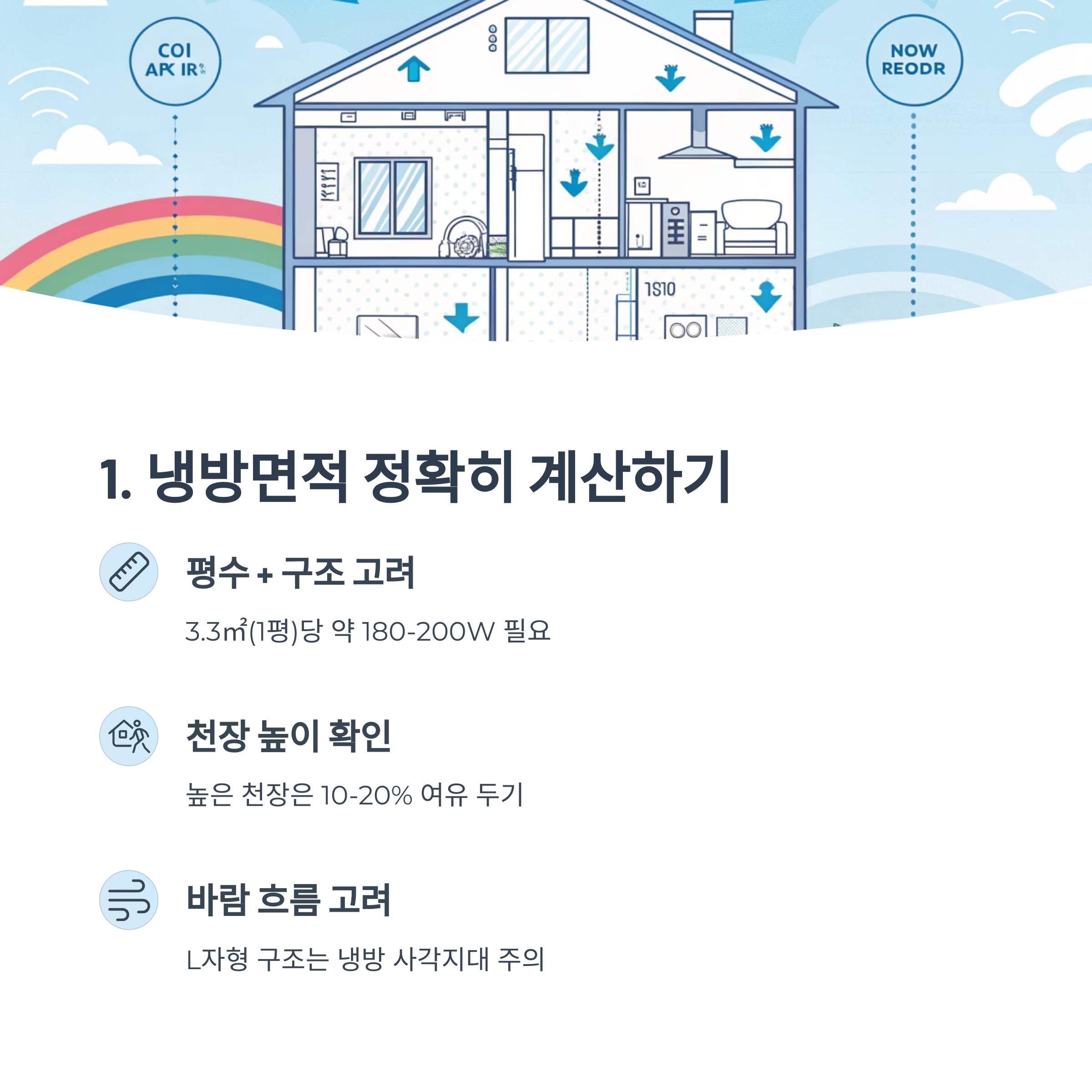 에어컨은 ‘집이 크니까 큰 거’, ‘방이 작으니까 아무거나’라는 식으로 골라선 안 됩니다. 냉방면적은 평수뿐 아니라 천장 높이, 창문 위치, 바람의 흐름 등을 함께 고려해야 해요. 일반적으로 3.3㎡(1평) 당 약 180~200W의 냉방능력이 필요하므로, 10평이면 약 2,000W, 즉 2kW 이상이 적절합니다. 공간이 넓거나 천장이 높다면 10~20% 여유를 두는 것이 좋고요. 특히 L자 구조나 거실+주방 통합형이라면 ‘냉방 사각지대’가 생기지 않도록 실내 구조를 잘 파악해야 합니다.