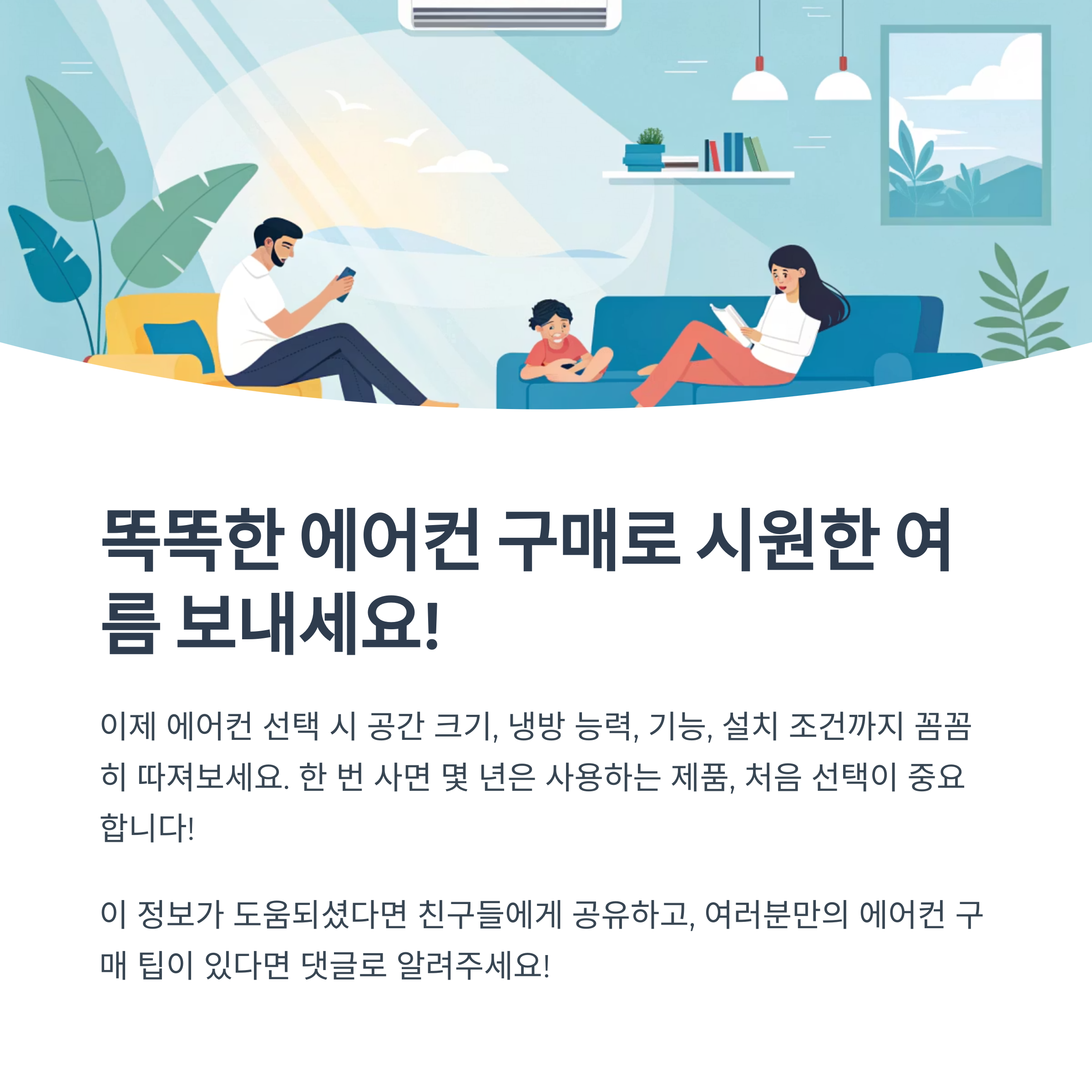 이제 에어컨을 선택할 때 단순히 브랜드나 디자인만 볼 게 아니라, 공간 크기, 냉방 능력, 기능, 설치 조건까지 꼼꼼히 따져봐야 한다는 사실을 아셨을 거예요. 한 번 사면 몇 년은 써야 하는 제품인 만큼, 처음 선택이 정말 중요하죠. 위의 6단계를 기준으로 하나씩 체크해 가며 선택하면, 무더운 여름에도 시원하고 후회 없는 소비를 할 수 있습니다. 여러분의 에어컨 쇼핑이 보다 똑똑하고 합리적인 선택이 되기를 바라며, 도움이 되셨다면 댓글이나 공유도 환영이에요!