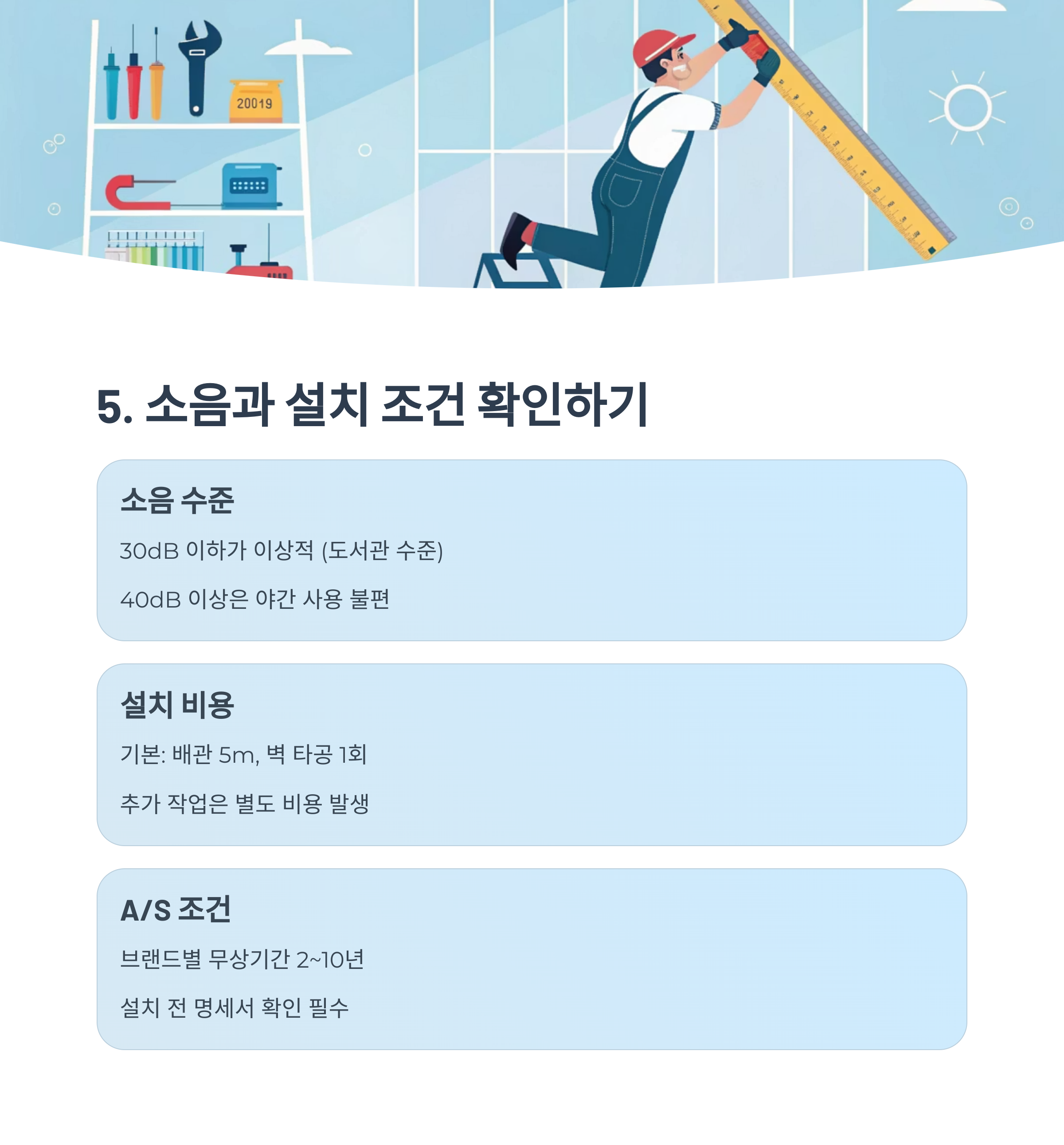마지막으로 놓치기 쉬운 포인트는 설치비와 사후 서비스입니다. 기본 설치는 무료인 경우가 많지만, 배관 추가, 벽 타공, 고소작업 등은 추가 요금이 발생할 수 있어요. 또, 고장이 났을 때 A/S가 얼마나 빠르고 확실한 지도 꼭 확인해야 합니다.