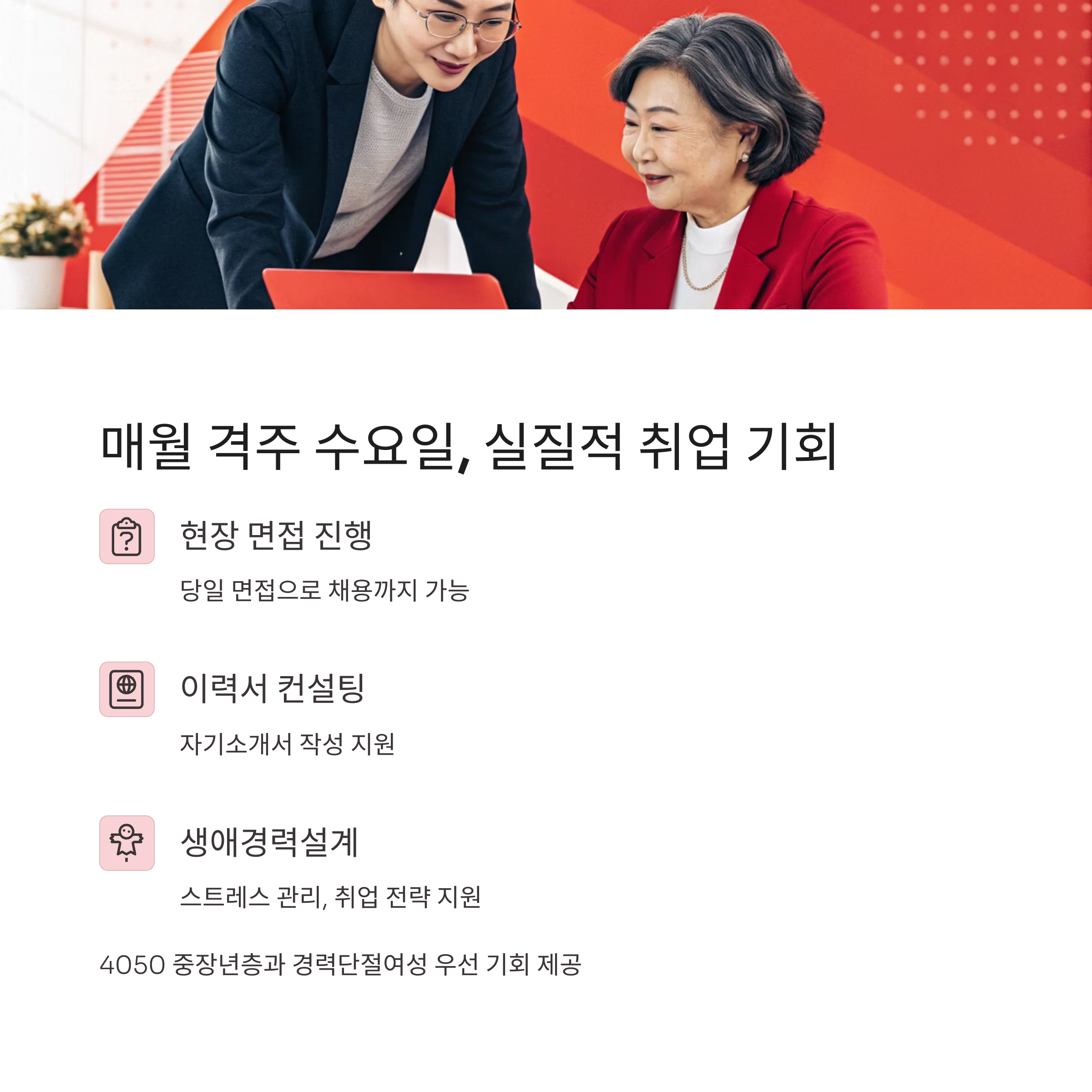 이력서 컨설팅, 스트레스 관리, 경력 설계 등 다양한 부대 프로그램도 함께 진행돼 실질적인 취업 지원이 가능합니다.