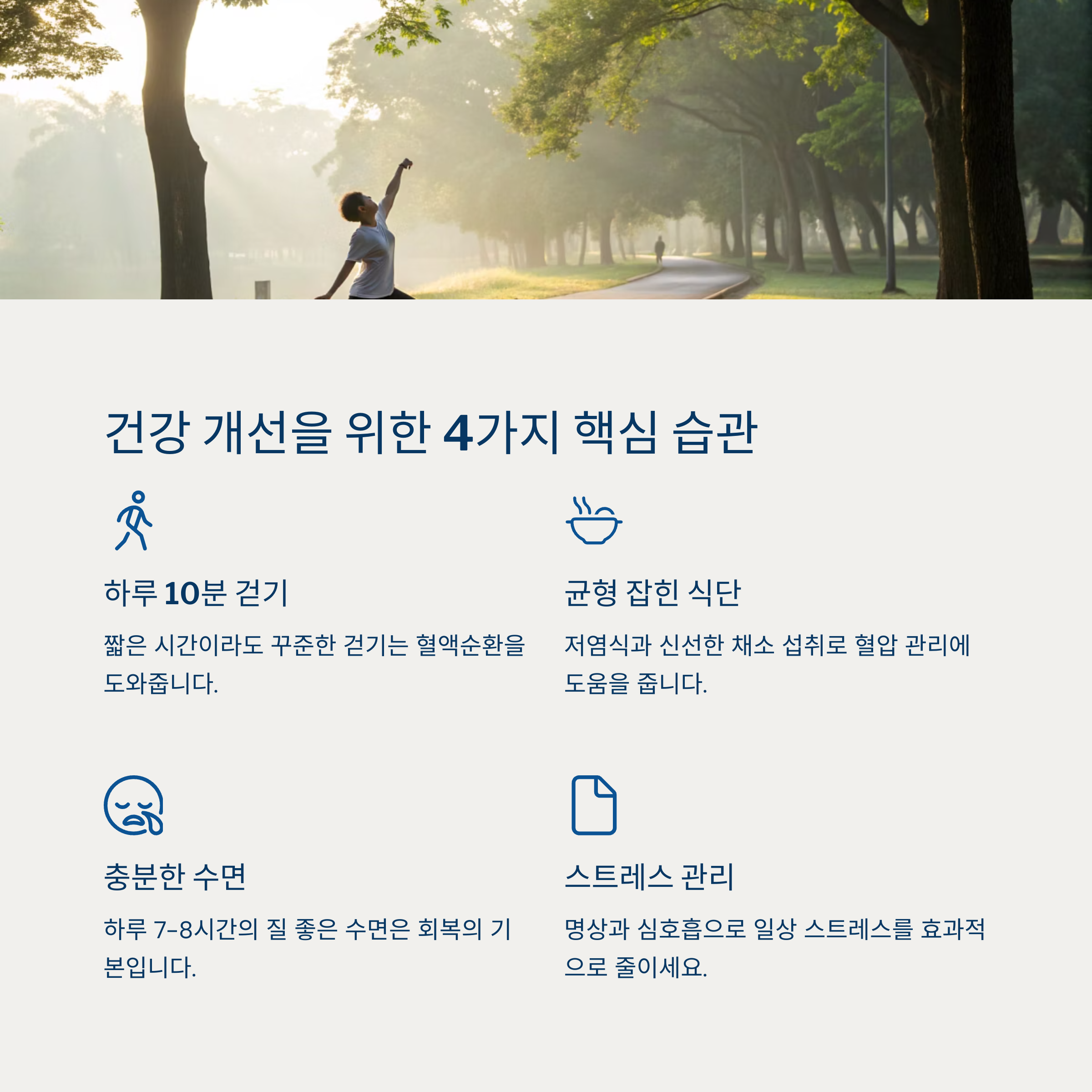 운동이 어렵게 느껴지신다면 우선 걷기부터 시작해 보세요. 하루 30분 걷기만으로도 혈압이 평균 5~10mmHg 낮아졌다는 연구 결과도 있어요. 중요한 건 '지속성'과 '리듬감'입니다.