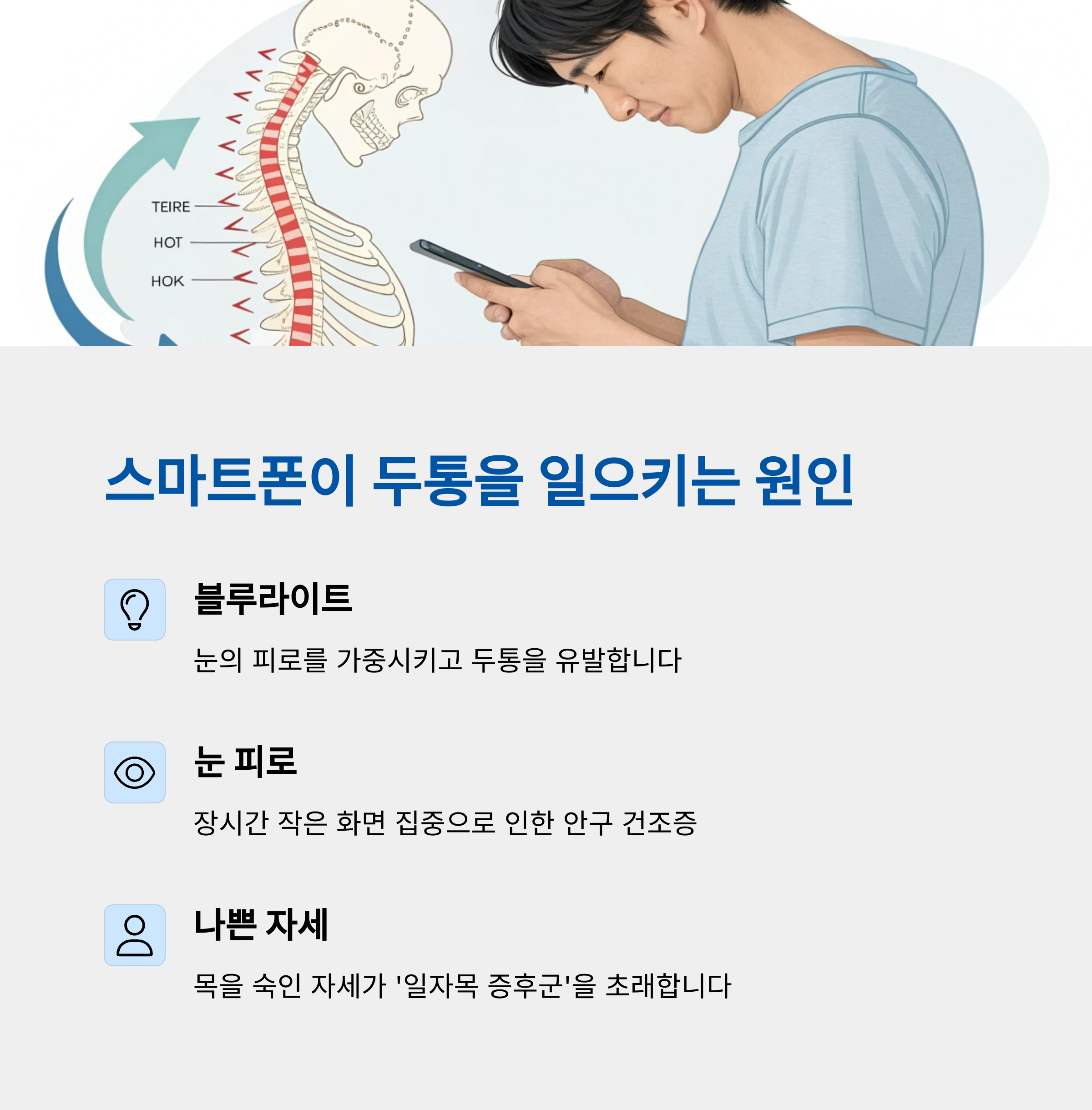스마트폰만 봤을 뿐인데 머리가 지끈지끈? 그 두통, 그냥 넘기지 마세요. 원인은 생각보다 가까이에 있습니다!