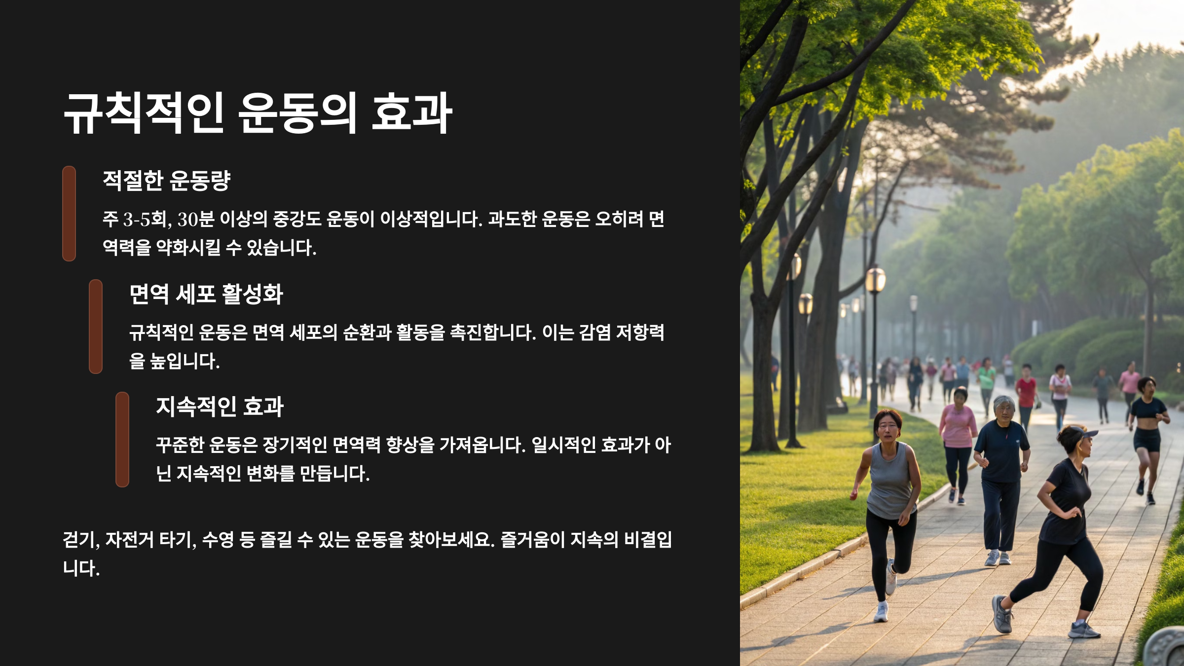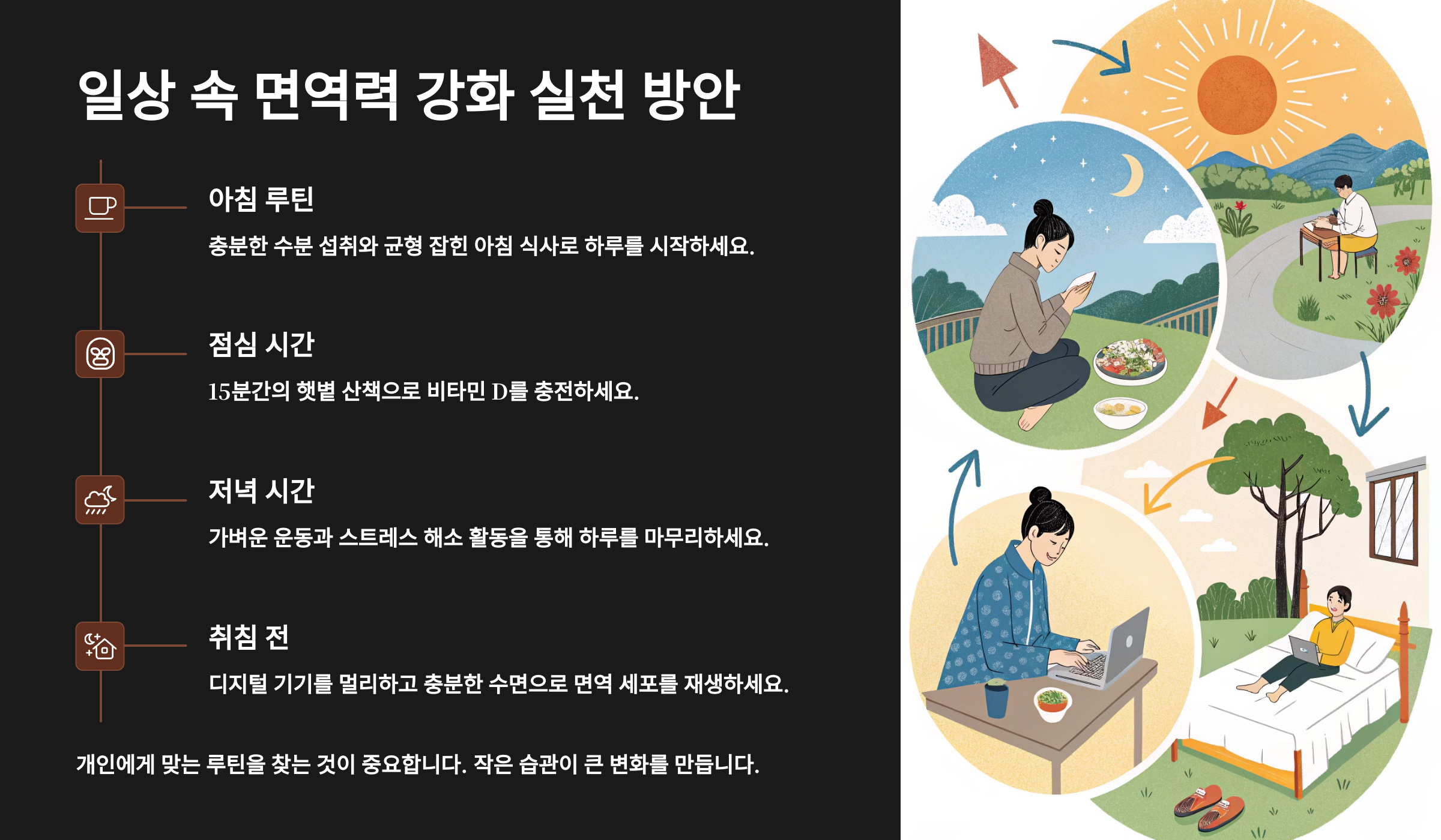 | 꾸준한 습관 | 매일 실천하는 루틴이 면역력 향상에 핵심입니다. |