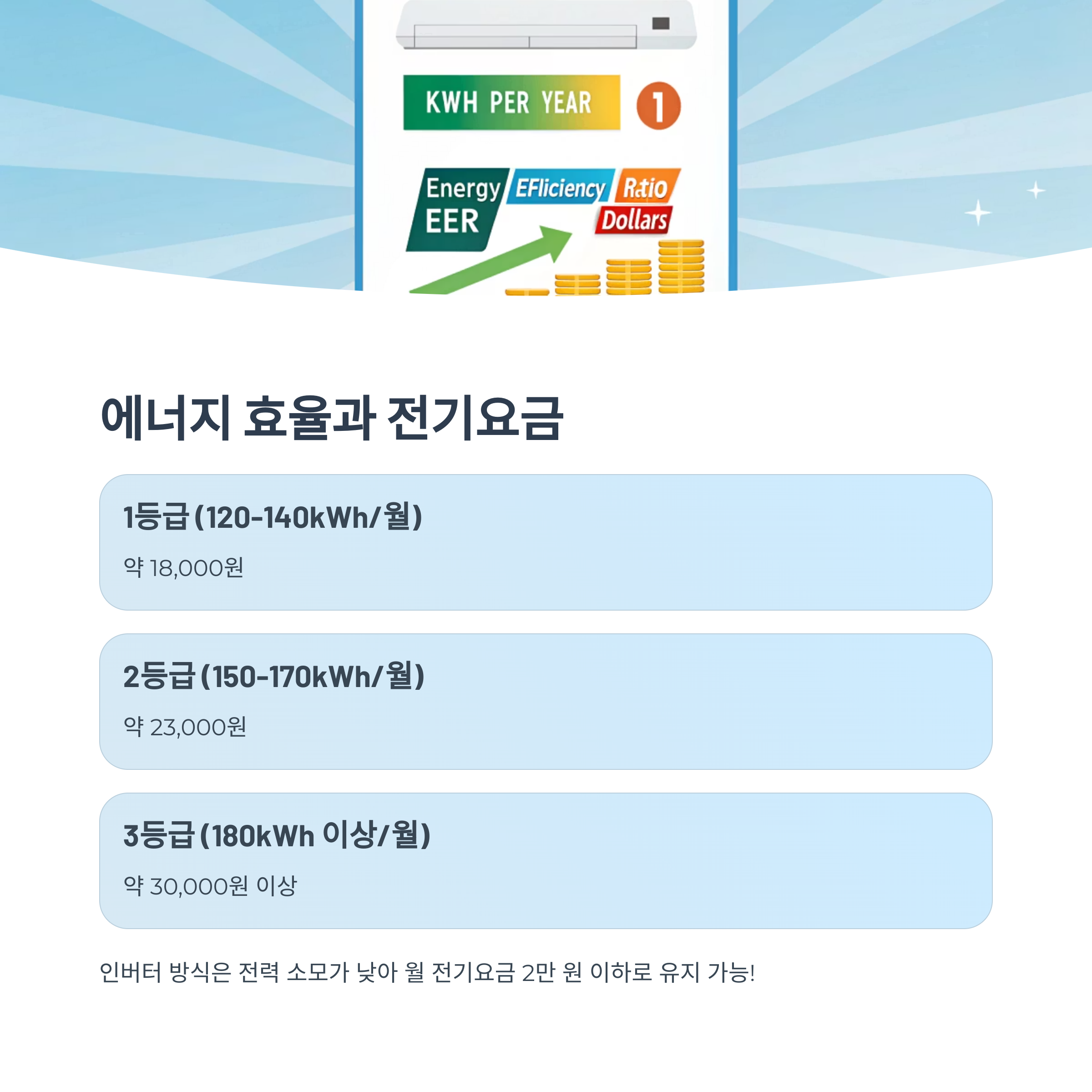 에너지 1등급 제품을 선택하고, 26~27도 설정으로 사용 시간을 줄이면 요금을 크게 줄일 수 있습니다.