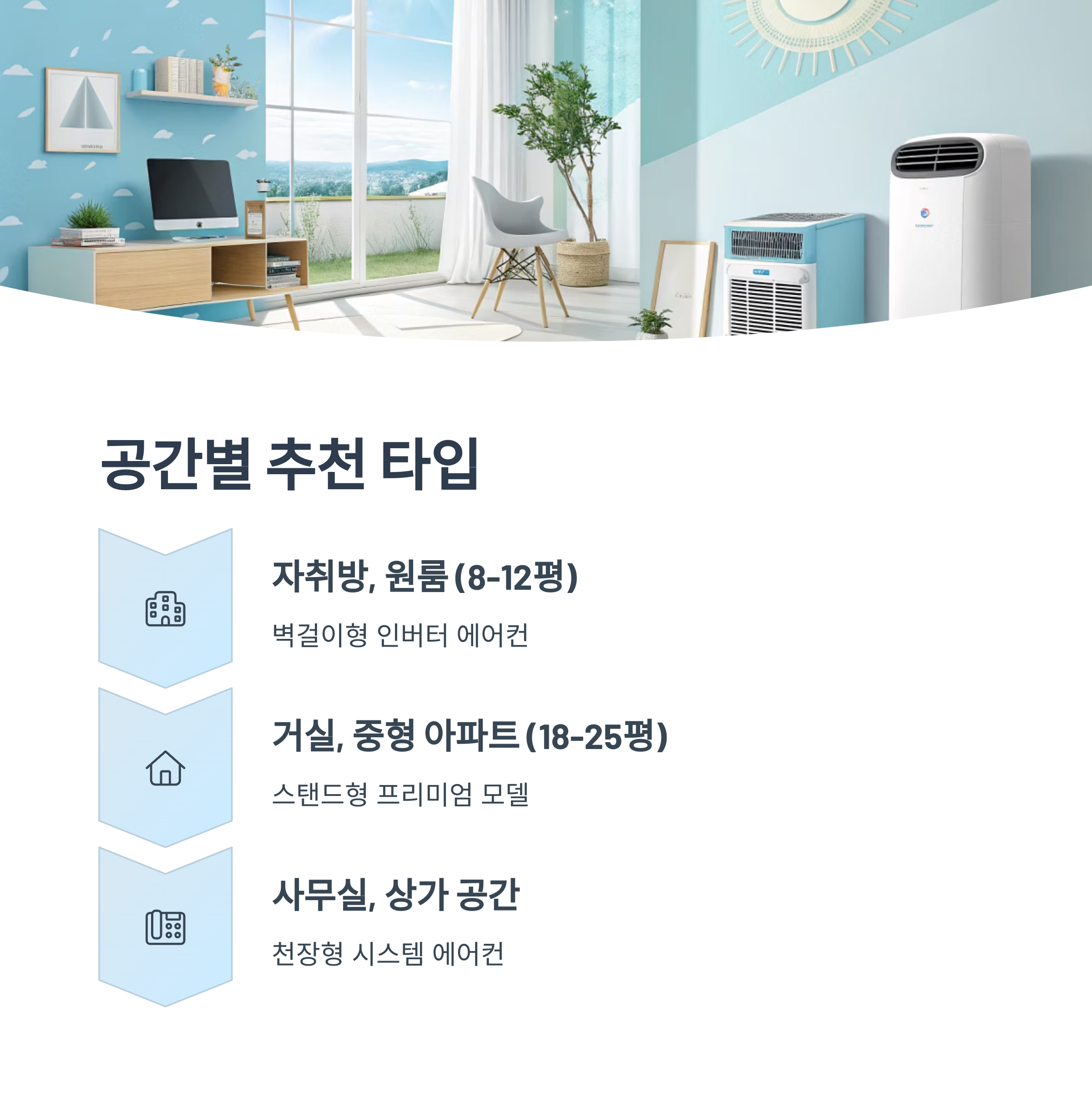 공간의 용도와 크기에 따라 적합한 에어컨 종류도 다릅니다. 아래 리스트는 공간에 따라 추천되는 2025년형 에어컨 유형이에요.