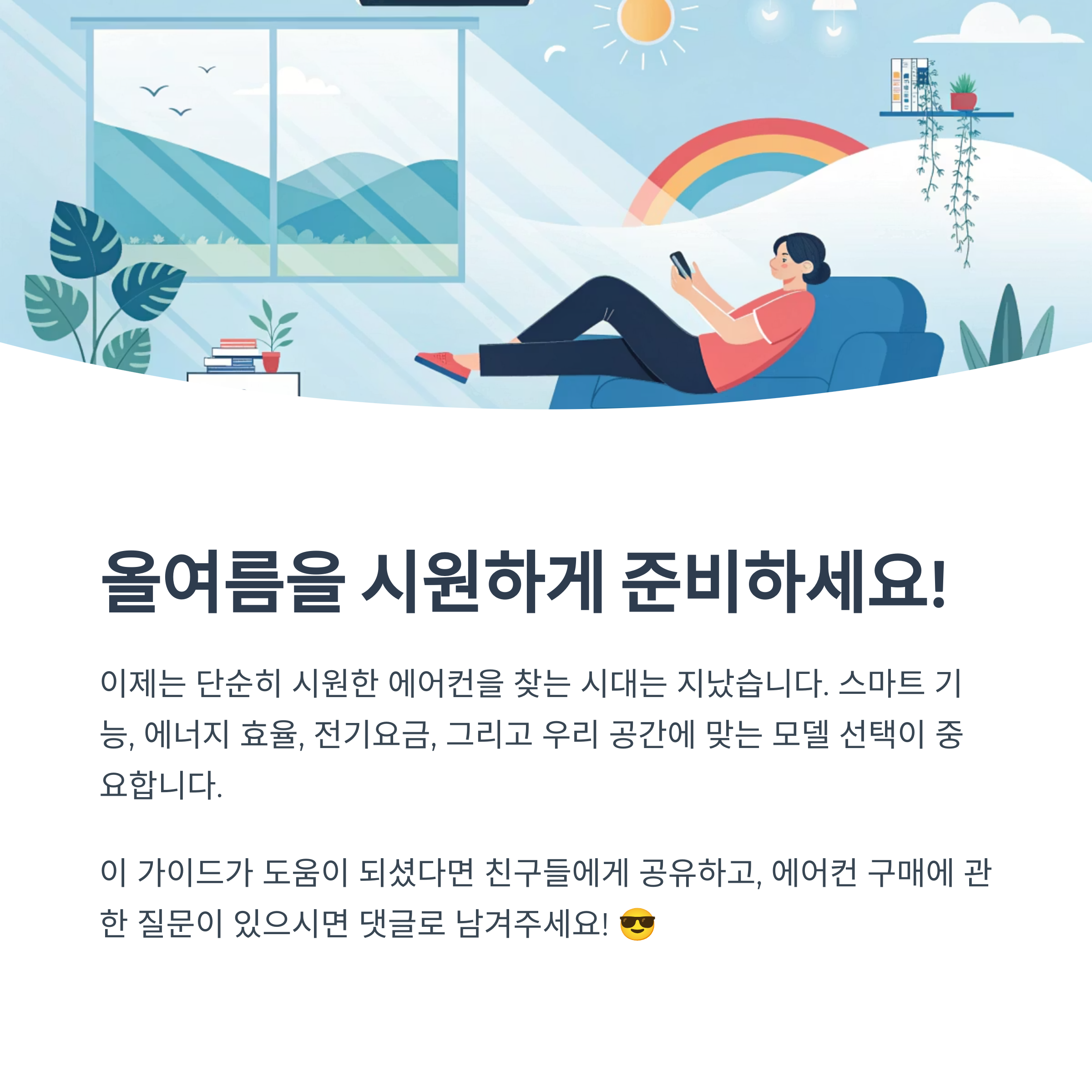 이제는 단순히 시원한 에어컨을 찾는 시대는 지났습니다. 2025년에는 스마트 기능, 에너지 효율, 전기요금, 그리고 우리 공간에 맞는 모델 선택이 중요하죠. 이번 가이드를 통해 여러분의 상황에 딱 맞는 에어컨을 고르셨으면 좋겠습니다. 올여름 무더위를 편안하고 시원하게 보내기 위한 첫걸음, 바로 지금이 그 타이밍이에요! 궁금한 점이나 고민되는 부분이 있다면 댓글로 언제든 이야기 나눠봐요. 😎