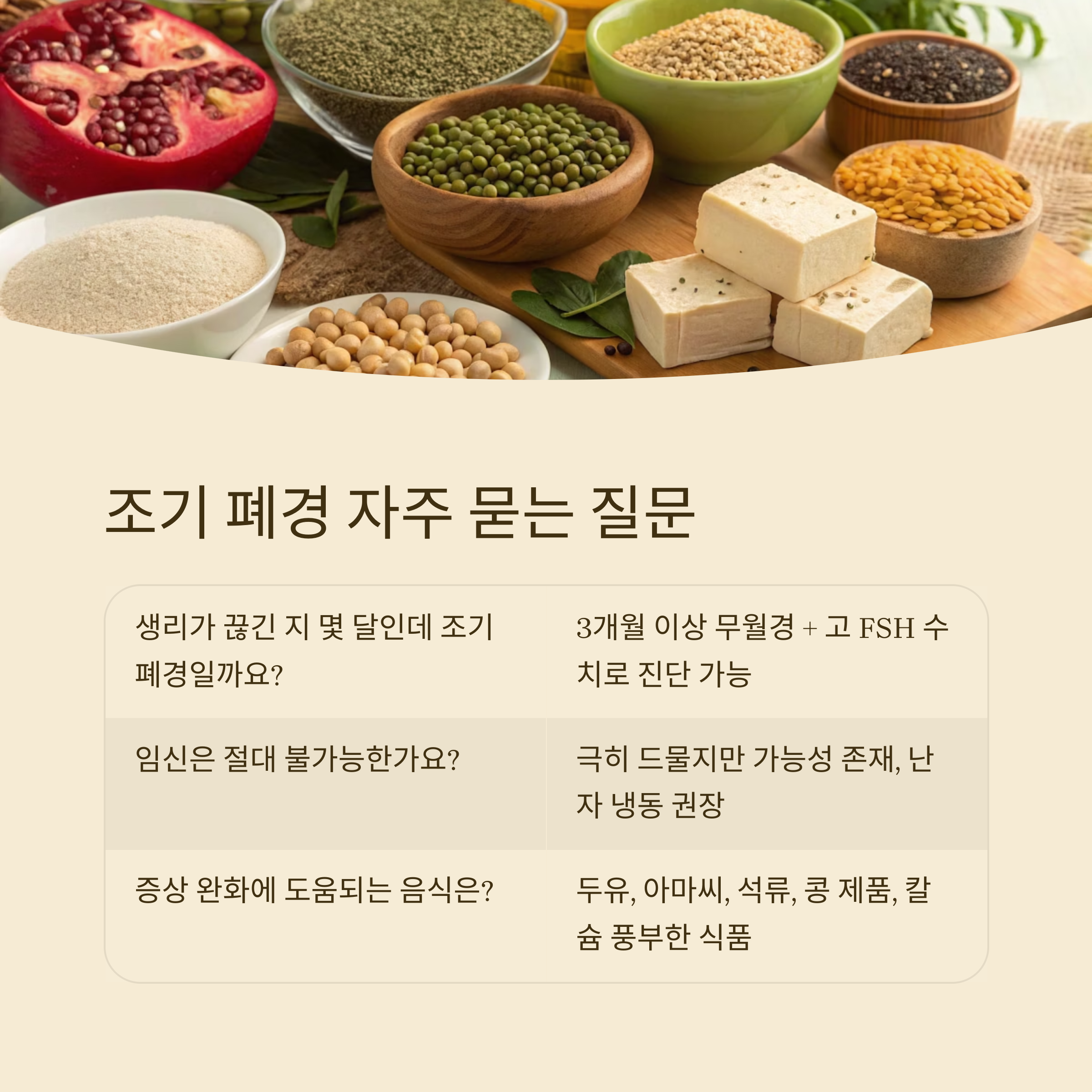 | 생리가 끊긴 지 몇 달인데 조기 폐경일까요? | 3개월 이상 무월경 + 고 FSH 수치 확인으로 진단 가능 |