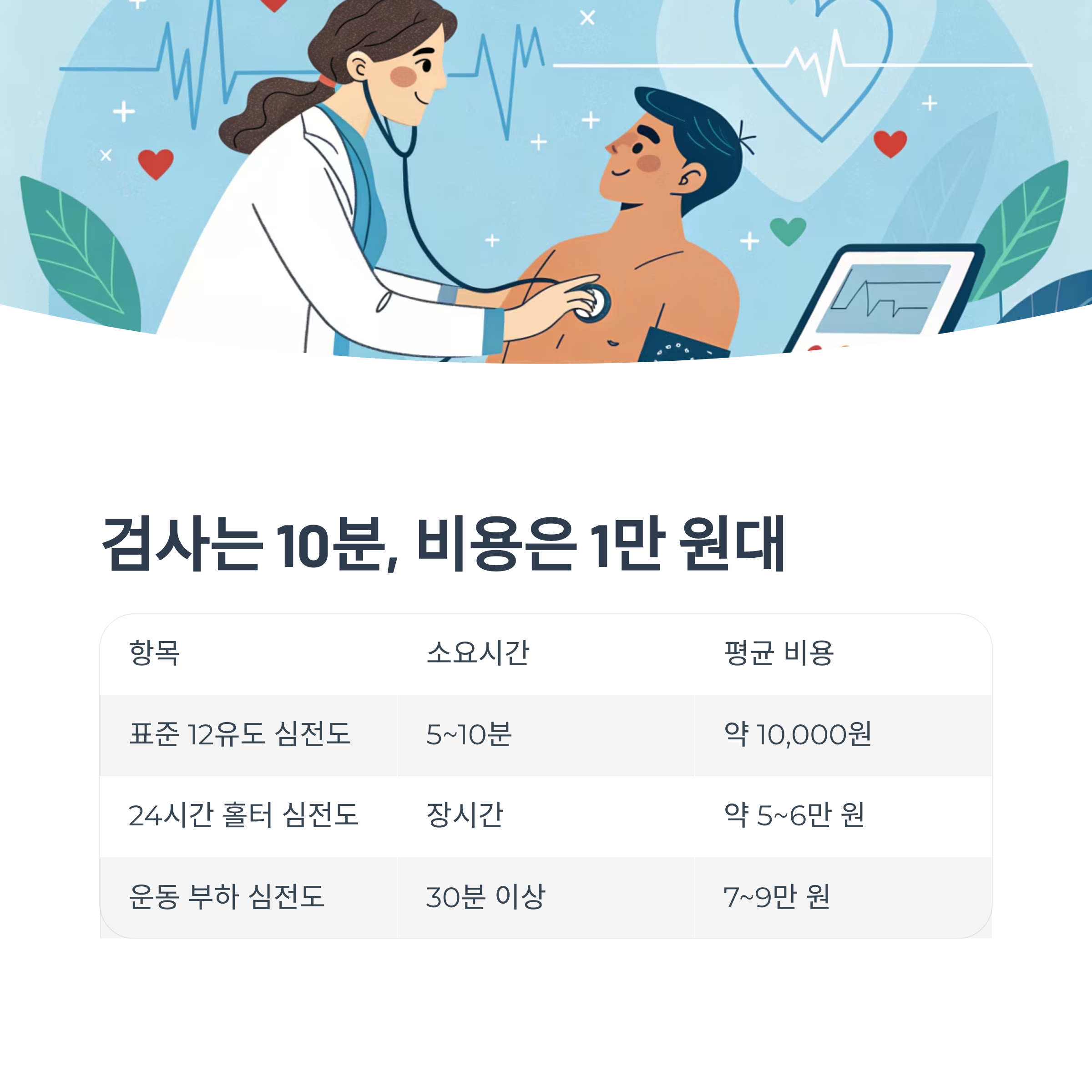 | 표준 12유도 심전도 | 5~10분 | 약 10,000원 내외 |