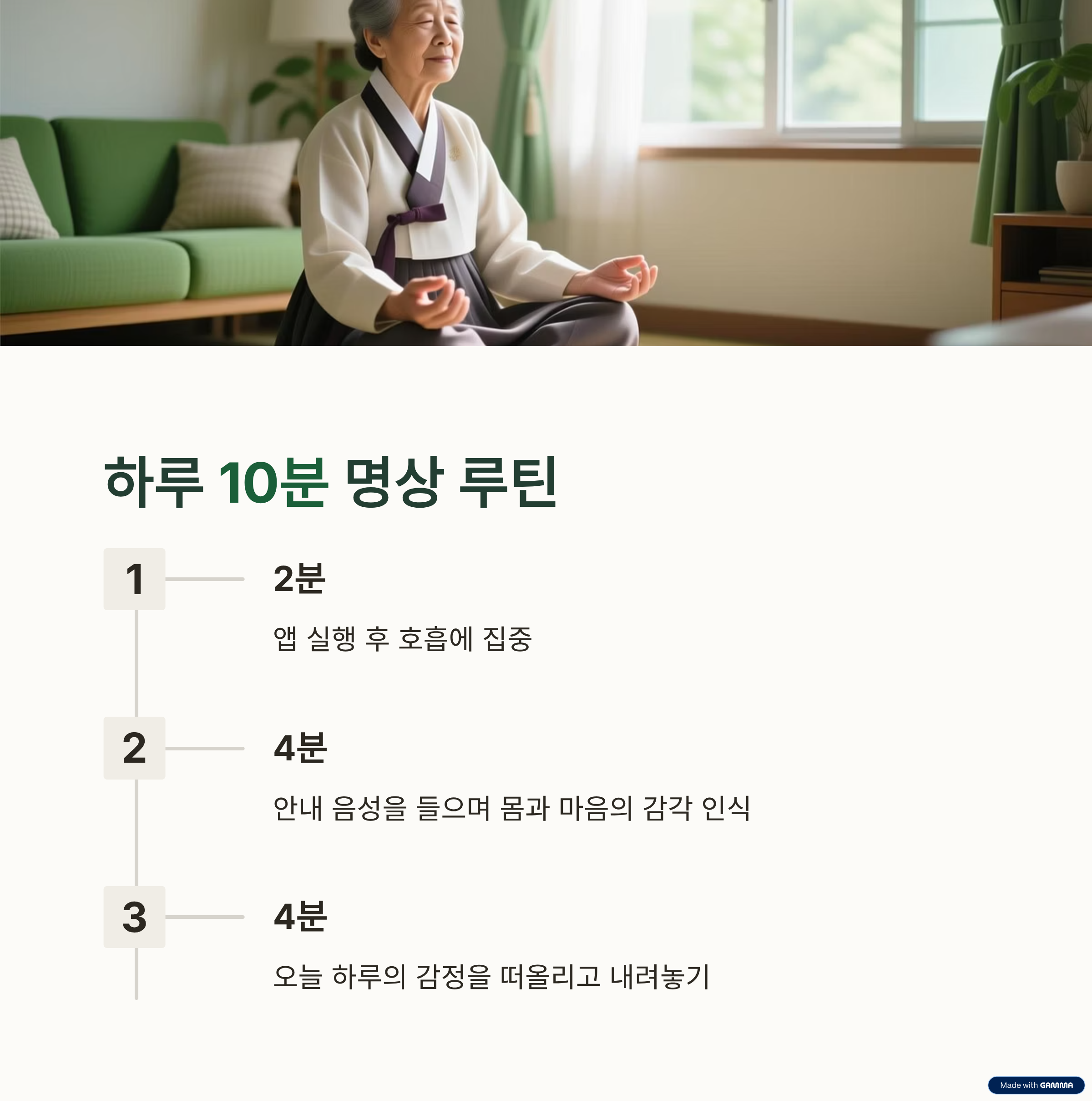 명상 앱을 활용하면 짧은 시간 안에 효과적인 명상을 실천할 수 있습니다. 특히 60대 분들에게는 10분 정도의 짧은 루틴이 부담이 적으면서도 꾸준히 유지하기 좋습니다. 아래는 하루 10분으로 구성한 명상 루틴 예시입니다.