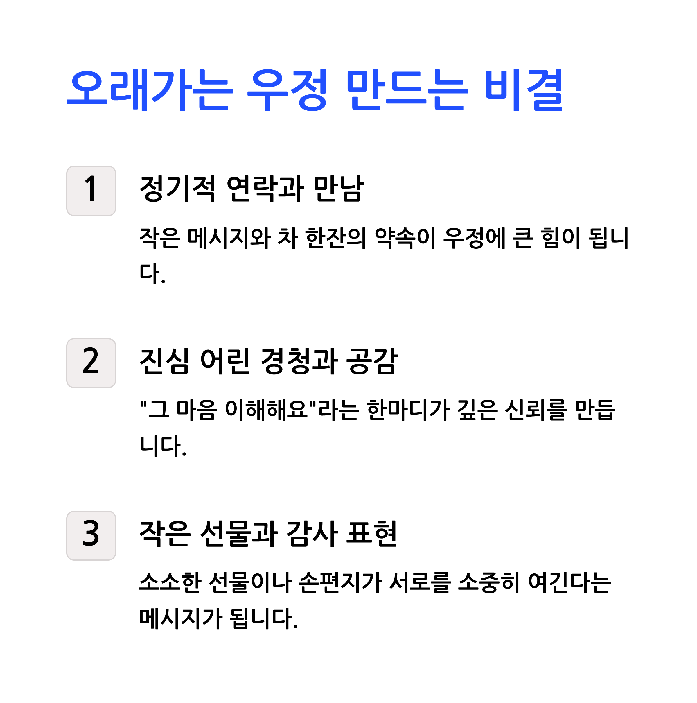 작더라도 꾸준히 연락하고 만나려는 노력이 중요합니다. 전화, 카카오톡, 안부 문자 등으로 마음을 전하며, 정기적인 산책이나 차 한잔 약속도 우정에 큰 힘이 됩니다.