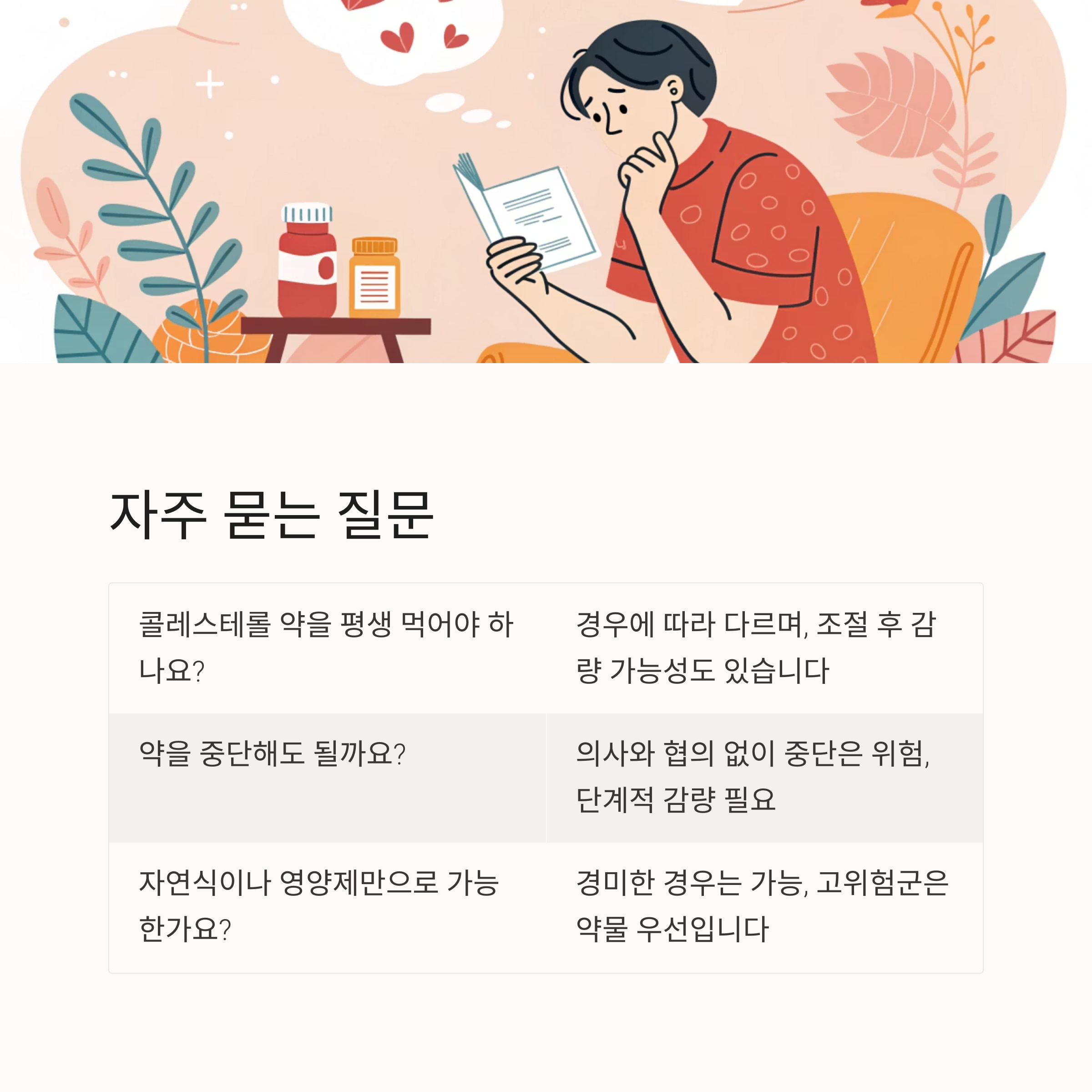 | 콜레스테롤 약을 평생 먹어야 하나요? | 경우에 따라 그렇지만, 조절 후 감량 가능성도 있습니다 |
